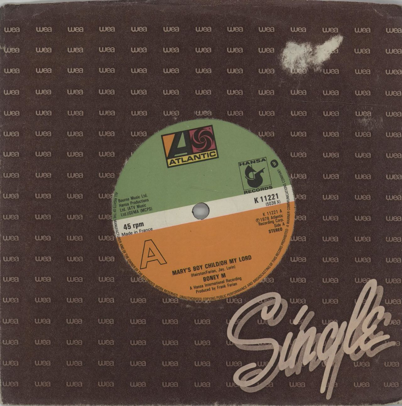 BONEY M Mary's Boy Child / Oh My Lord (Classic 1978 UK French-pressed 7" vinyl single, also includes Dancing In The Streets, WEA company die-cut paper sleeve K11221)