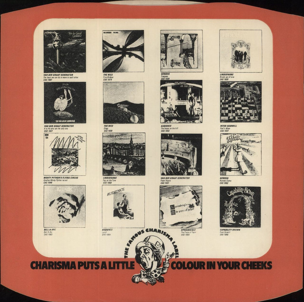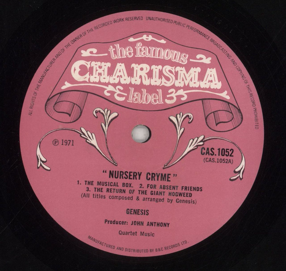 GENESIS Nursery Cryme (Rare original 1971 UK Charisma pink scroll label 7-track vinyl LP, the third studio album from the English rock band, first issue textured gatefold picture sleeve with scroll logo printed on the inside and scarce companyinner CAS1052)