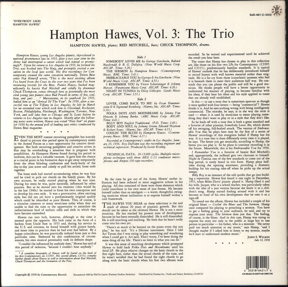 HAMPTON HAWES Everybody Likes Hampton Hawes Vol. 3: The Trio (1990 US issue of the 1956 10-track mono LP, also starring Red Mitchell & Chuck Thompson. The glossy picture sleeve shows a little mild age wear with no deletion cuts & the vinyl isExcellent with minimal signs of play. Great west coast jazz C3523)