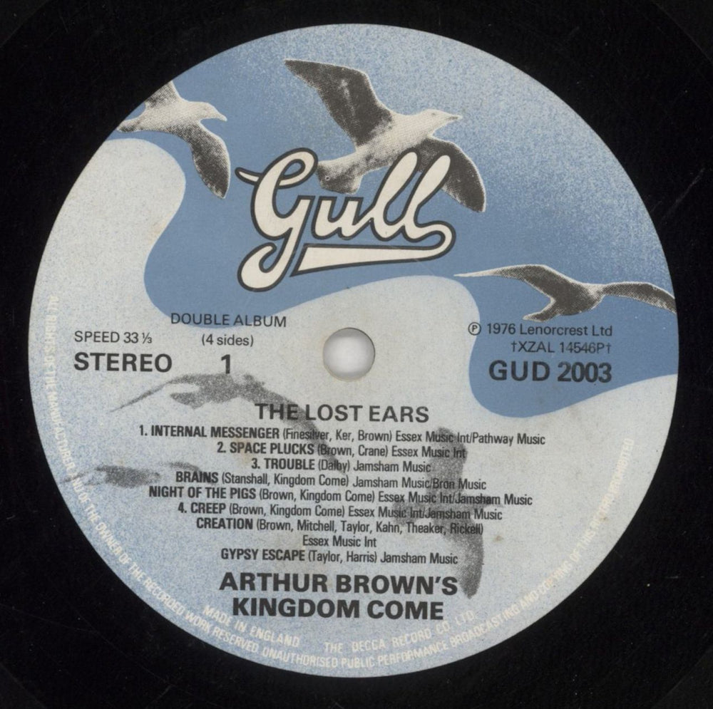 ARTHUR BROWN'S KINGDOM COME The Lost Ears (Hard to find original 1976 UK Gull label 22-track double vinyl compilation LP in great gatefold picture sleeve featuring a Chris Welch interview with Arthur printed inside. The cover displays some noticable shelfwear whilst the vinyl has a few light signs of play, overall a great play copy of this rarity GUD2003/4)