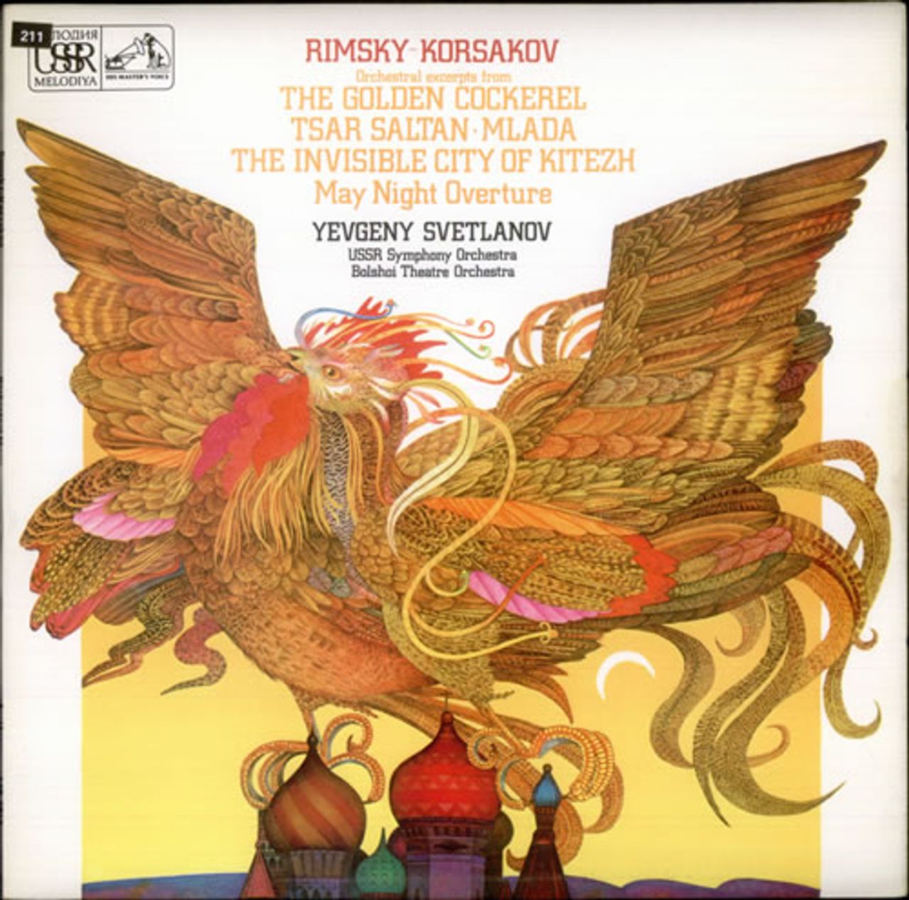 RIMSKY-KORSAKOV Orchestral Excerpts from The Golden Cockerel, Tsar Saltan, Mlada, The Invisible City of Kitezh and May Night Overture (1978 UK HMV/Melodiya label stereo vinyl LP. Performed by the USSR symphony Orchestra and Bolshoi theatre Orchestra conducted by Yevgeny Svelkanov. The record collects excerpts from the all Russian composer's most famous operas. Fully laminated picture sleeve with extensive liner notes. The sleeve shows minimal wear and the vinyl appears barely played ASD3710)