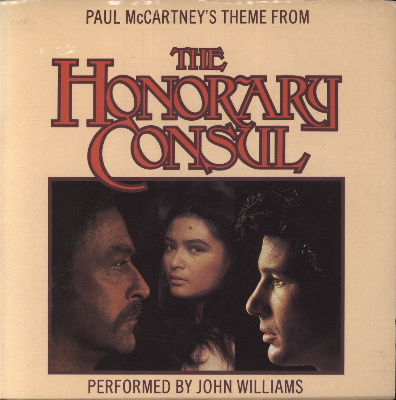 PAUL McCARTNEY/JOHN WILLIAMS Paul McCartney's Theme From The Honorary Consul (Rare 1983 UK Island label soundtrack 7" vinyl single performed by John Williams, also includes 'Clara's Theme' by Quimantu, housed in a thin card glossy flipback picture sleeve. The sleeve has some light wear along the opening edge and a small sticker mark on the front, and the vinyl has minimal signs of play, an Excellent example IS155)