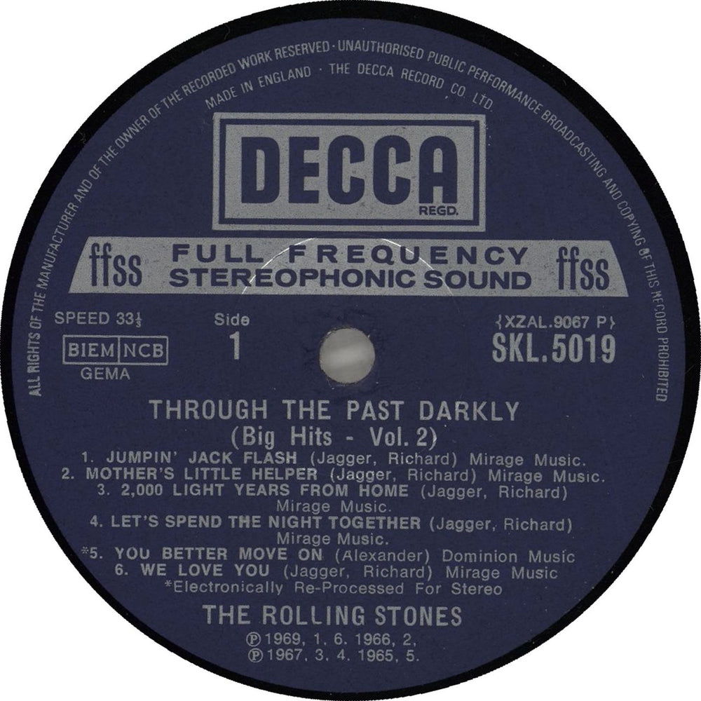 ROLLING STONES Through The Past Darkly (Early 70s [circa 1970-72] UK issue of the 1969 12-track stereo vinyl LP on the Decca 'boxed' label with 'Through The Past Darkly' and 'Big Hits Vol.2' on separate lines and side number to the left of thespindlehole. The front-laminated picture sleeve displays the die-cut mono / stereo indicator on the back and has only general age and shelf wear evident with the vinyl showing light spindlewear to indicate play SKL5019)