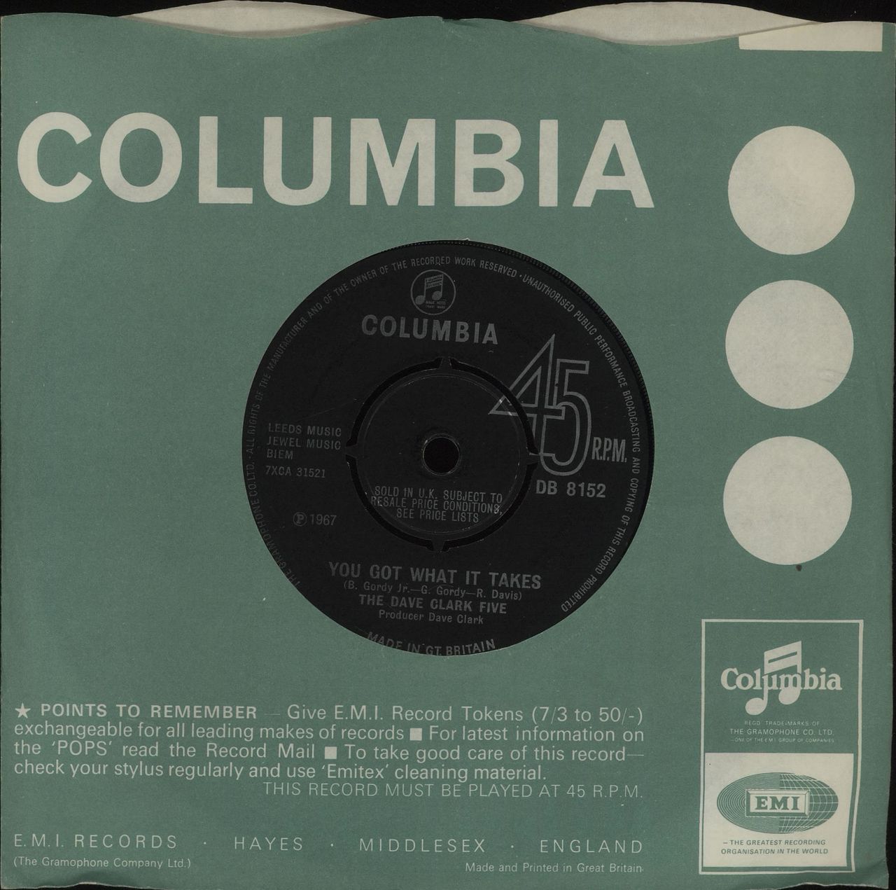 DAVE CLARK FIVE You Got What It Takes (1967 UK 7" vinyl single with four-prong centre & 'The Gramophone Co' label perimeter text & 'Sold In The UK' text, includes Sitting Here Baby, die-cut Columiba company sleeve DB8152)