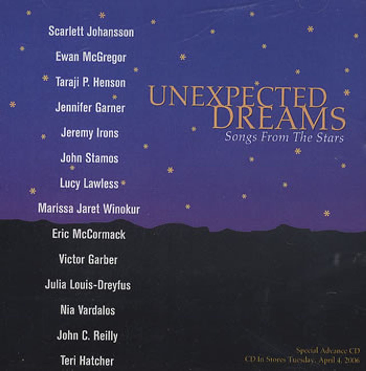 VARIOUS ARTISTS Unexpected Dreams: Songs From The Stars (Official 2006 US Rhino label 14-track advance CD-R acetate - A sparkling array of top film and television stars come together to sing delightful new versions of favorite contemporary night,love, and dream-themed musical selections, all accompanied by members of the Los Angeles Philharmonic Orchestra. Features the musical talents of celebrities includingScarlet Johansson, Ewan McGregor, John Stamos, Jennifer Garner, Victor Garber and more. Custom printed disc with custom picture sleeve and back title/tracklisting insert)