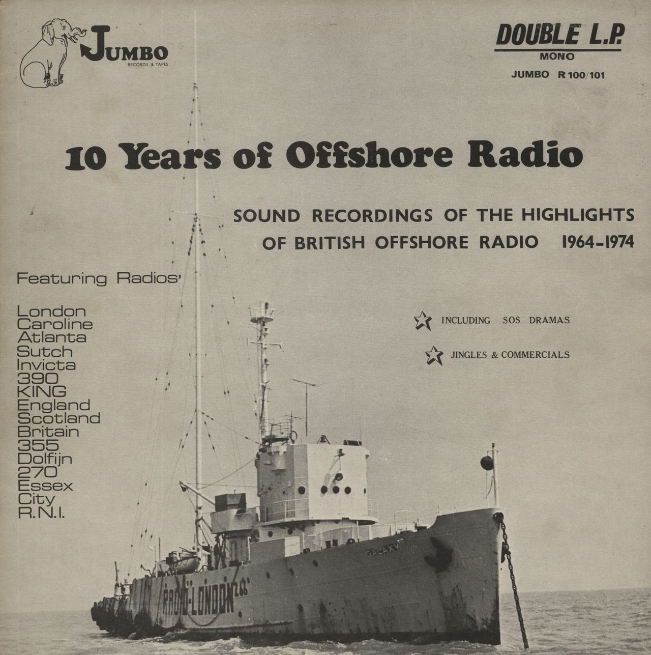 VARIOUS-FILM, RADIO, THEATRE & TV 10 Years Of Offshore Radio (Rare original 1974 UK double vinyl LP, featuring airchecks from the Sixties offshore stations on record one. Record two features station jingles including the Radio London theme 'Big Lil' and extracts from Radio Northsea International during 1970 to 1971. Of Particular interest is the excerpt from Radio Sutch - Screaming Lord Sutch's radio station & the inclusions of the final closedown broadcasts & even SOS signals! The album was reissued in revised form to remove all copyright reserved material, the later issues carry a small sticker on the cover to this effect - This is the original version! The sleeve is Excellent with some faint foxing and age wear. The vinyl reveal minimal signs of play R100/101)