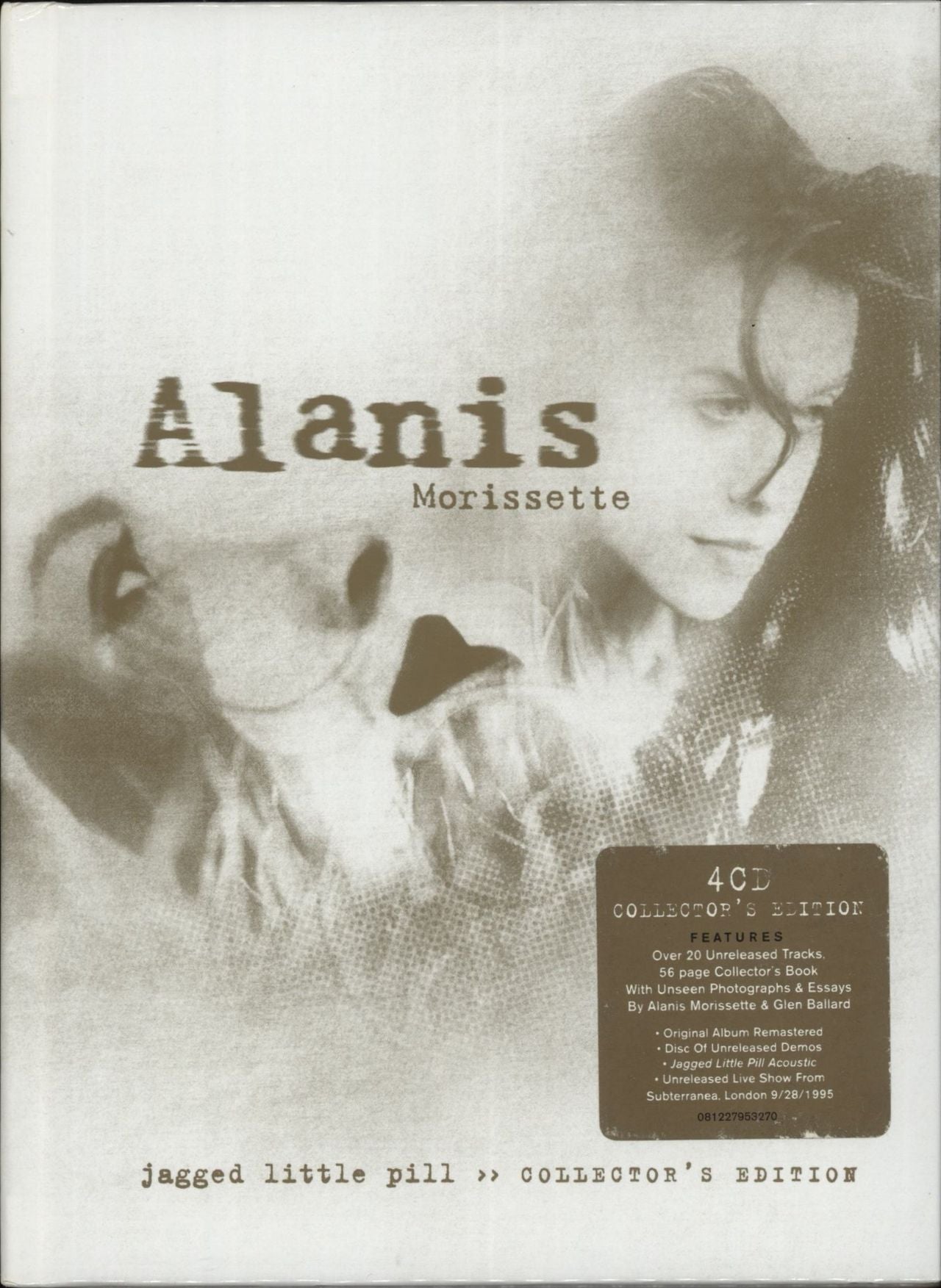 ALANIS MORISSETTE Jagged Little Pill (2015 UK Deluxe 20th Anniversary Collectors Edition 4-disc CD set comprising a digitally remastered version of her classic third studio album which spawned the massive hit singles You Oughta Know, Hand In My Pocket & Ironic plus a collection of acoustic versions, previously unreleased demo recordings and a set of live tracks recorded in London in September 1995. All four discs are housed superbly in the hard-back book with a 56-page booklet withunseen photographs & essays by Alanis and Glen Ballard. This example has the hype sticker from the shrink attached to the front and displays just light wear, and all discs are clean with no surface scuffs)