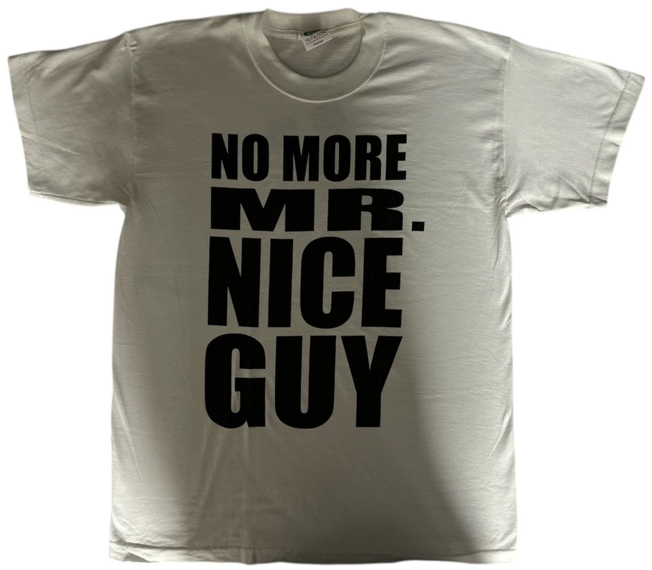 ALICE COOPER The Eyes Of Alice Cooper Tour 2004 (2004 original white t-shirt for his 2004 tour of Europe. The front image shows the classic lyric 'No More Mr. Nice Guy' and the back lists all 17 dates of the tour. Made from 100% cotton with its original Fruit Of The Loom label intact inside the collar. Overall, the garment shows minimal wear (looks unworn) and retains its vibrant print to the front and back)