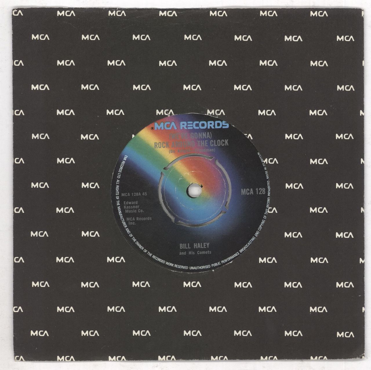 BILL HALEY & HIS COMETS Rock Around The Clock (1974 UK 3-track 7" vinyl single with the intact four prong centre, also including Rip It Up and Shake Rattle And Roll. Issued in a MCA company die-cut paper sleeve, the vinyl appears in excellentcondition MCA128)