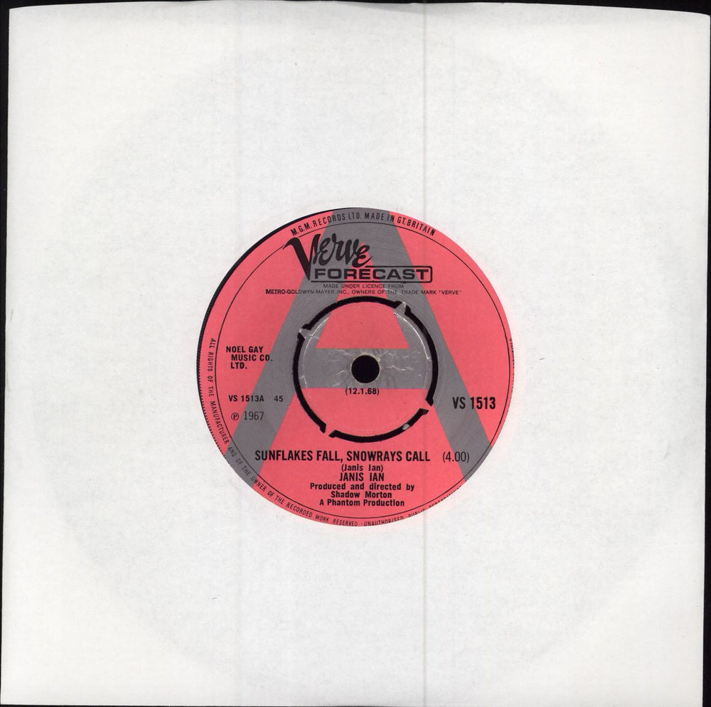 JANIS IAN Snowflakes Fall, Snowrays Call (1967 UK demonstration 'A' label vinyl 7" for the single release with four-prong centre and '12.1.68' release date text, includes Insanity Comes Quickly To The Structured Mind, only the second single released by the acclaimed US singer songwriter, plain die cut paper sleeve VS1513)