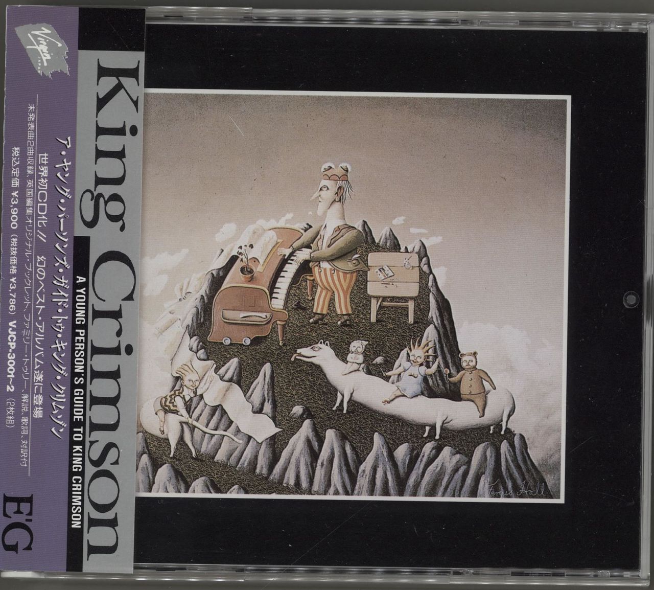 KING CRIMSON A Young Person's Guide To King Crimson (Scarce 1990 Japanese 15-track double CD compilation of the 1976 UK Polydor release, with superb picture sleeve booklet containing lyrics with English & Japanese text plus additional fold-outinsert with discography and nice mini 'In The Wake of King Crimson' family tree poster. Housed in its original fat double jewel case with front and back picture sleeve inlays, all in fantastic near mint condition and complete with obi-strip!VJCP-3001~2)