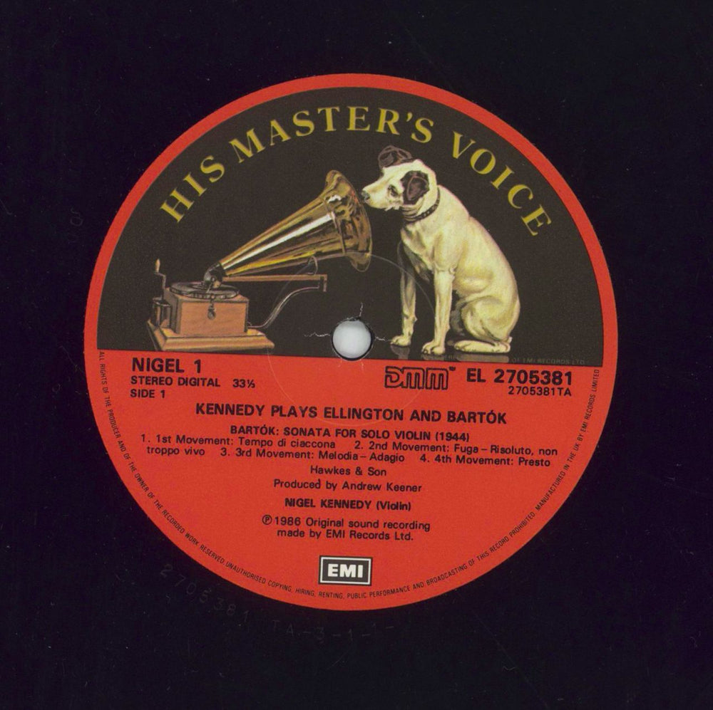 NIGEL KENNEDY Mainly Black and Sonata for Solo Violin (1986 UK HMV reproduction semi label Direct Metal Mastered stereo vinyl LP. Performed with alec Dankwork playing Double bass. This intruiging record includes Kennedy's original arrangement ofDuke Ellington's Black, Brown and Beige alongside Bartok's Sonata fro Solo violin from 1944. Glossy picture sleeve with vintage price sticker extensive liner notes by Nigel Kennedy NIGEL1)