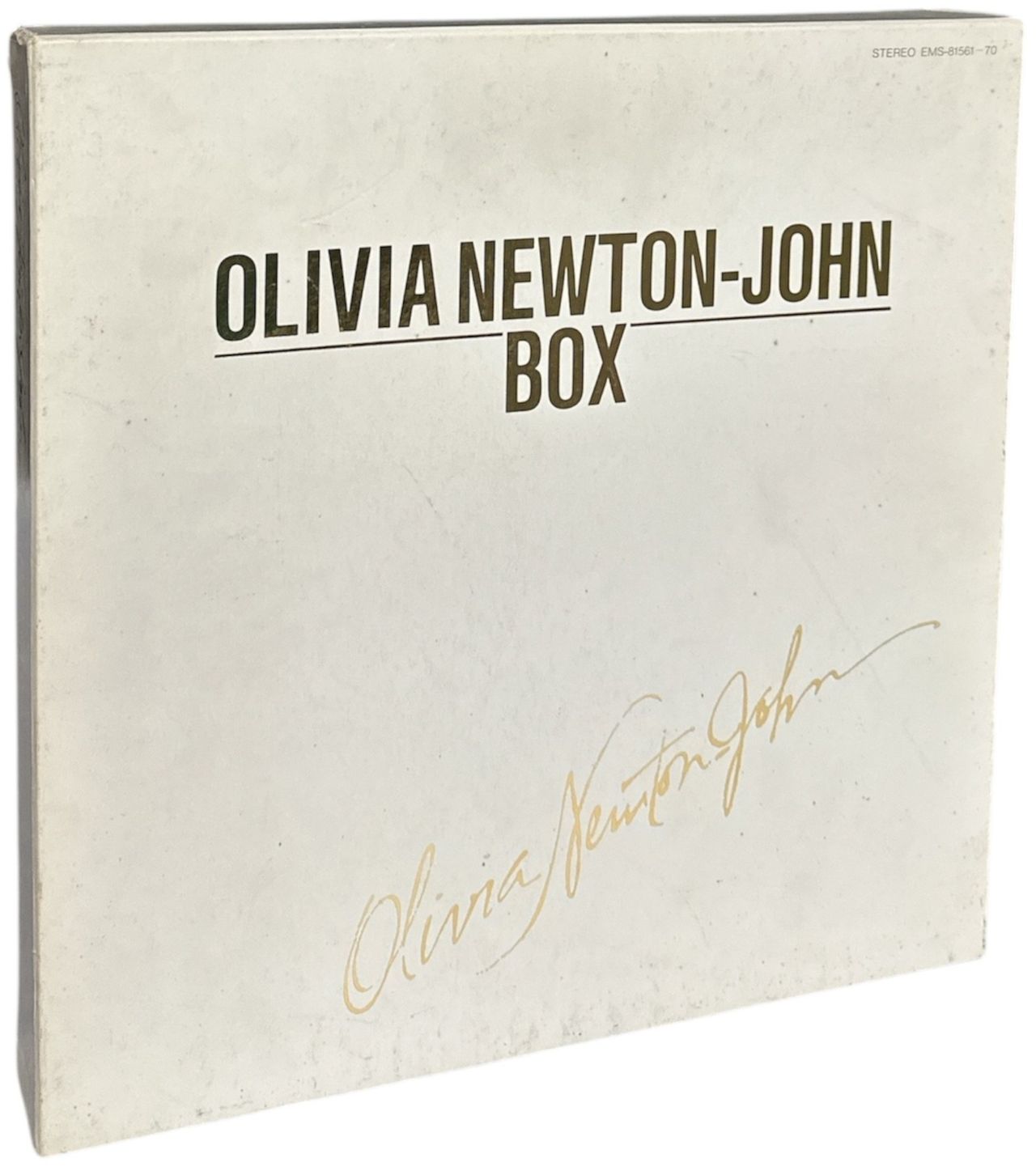 OLIVIA NEWTON JOHN Olivia Newton John Box (Rare 1983 limited edition Japanese-only 10-LP box set, including a special 'Private Message Part 1 & 2' promo only 7" with custom title insert [BRP-1010], a 12-page glossy photo booklet & 28-page lyric booklet plus chronology in a pink bag, all housed in a deluxe gold embossed box. The box has some light foxing and a small split at the top left corner, a few of the sleeves have some light foxing, and the vinyl has minimal signs of play. Anice example of this hard to find box set outside of Japan! EMS-81561~70)