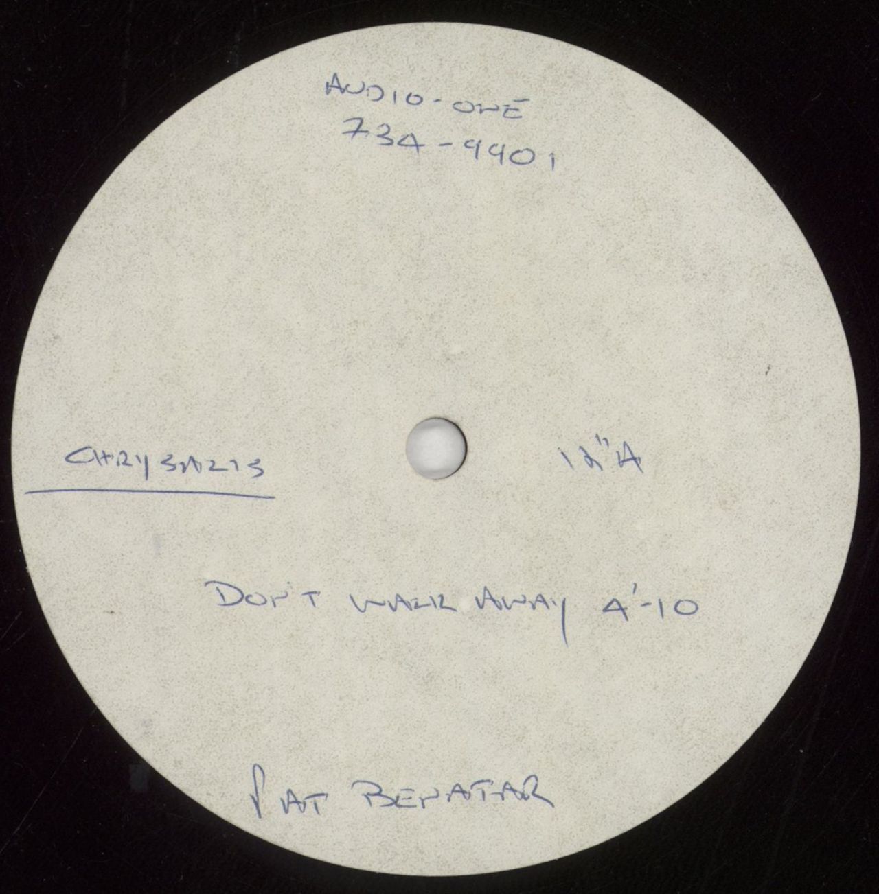 PAT BENATAR Don't Walk Away (Rare 1988 UK 12" double-sided metal based high grade methyl cellulose lacquer actetate for the two tracks on the 7" single release, also featuring Lift 'Em On Up, which is incorrectly titled here as 'Lift Him On Up', with plain white labels hand-annotated with artist, record company, song titles, timings as well as ' Audio-one 734-9901', plain sleeve. The disc shows scuffs and light marks commensurate with being an industry item. Acetates from this eraare created in very small numbers indeed, certainly nomore than a handful, for studio sonic reference & are normally destroyed afterwards, so seldom surface for sale)