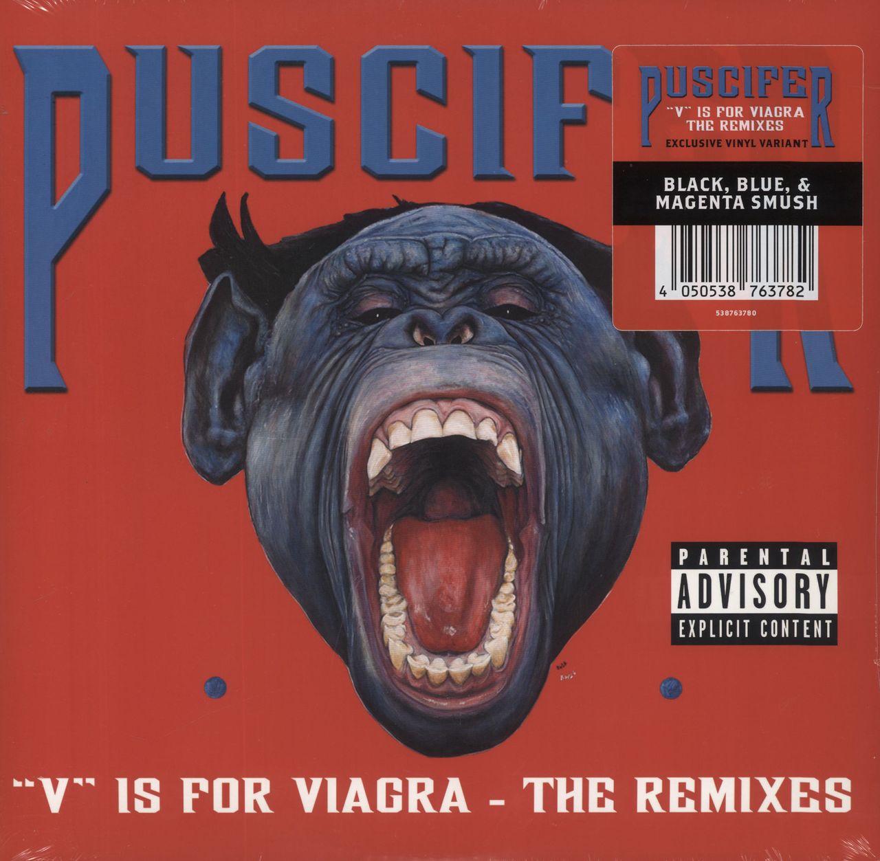 PUSCIFER "V" Is For Viagra: The Remixes (2023 UK/EU/US limited edition 'Exclusive Vinyl Variant' 13-track double album 2-LP set reissue of their 2008 compilation, now pressed on Black, Blue & Magenta Smush Vinyl; comprising ten remixes of tracks from their first album "V" Is for Vagina, as well as two remixes of the non-album single 'Cuntry Boner'. Factory sealed picture sleeve with a hype sticker)