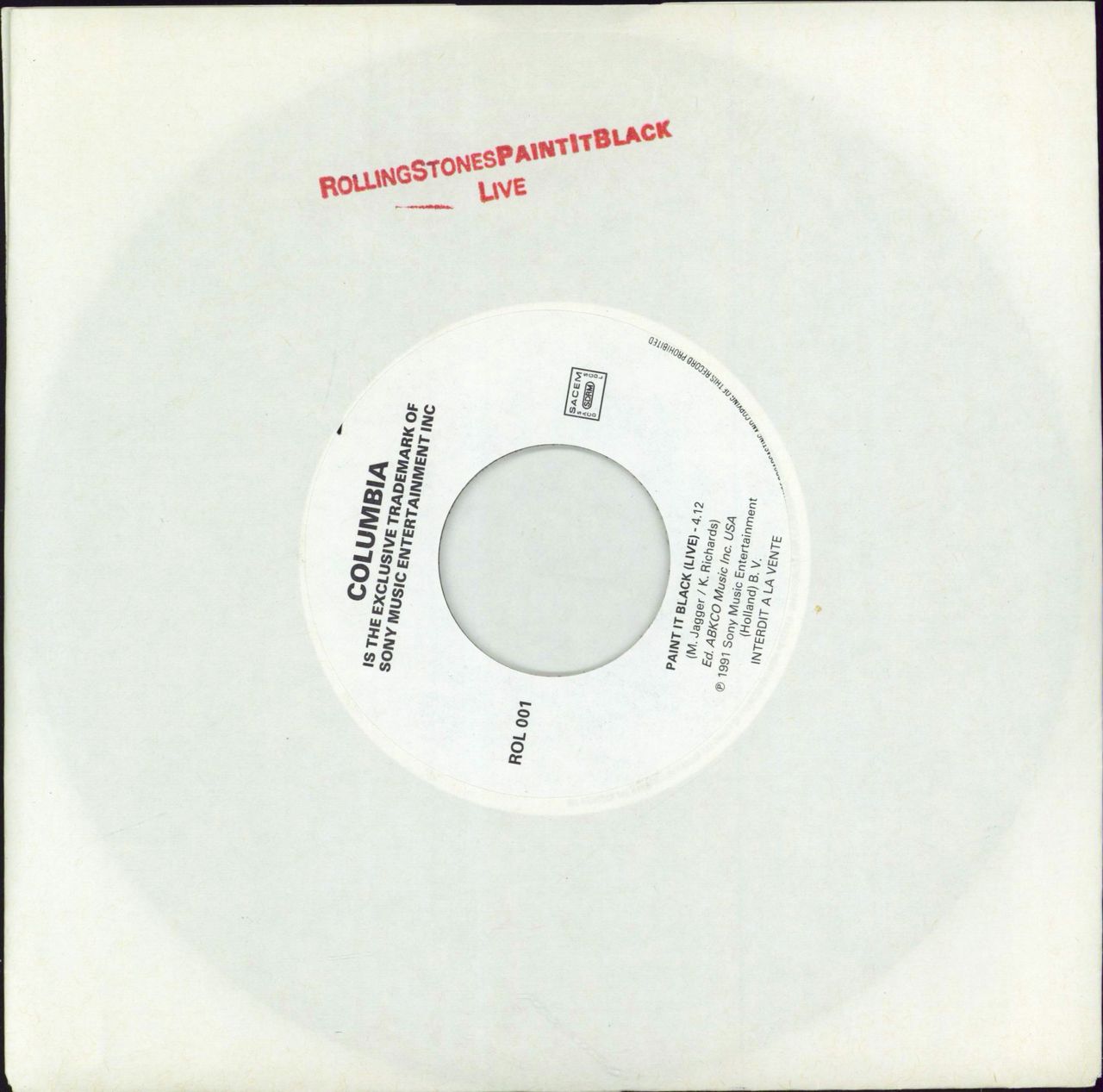 ROLLING STONES Paint It Black Live (Rare 1991 French one sided wide centre promotional vinyl 7", with a custom black printed white label and housed in a custom red stamped sleeve. The vinyl remains in a really nice condition with very little signs of play ROL001)