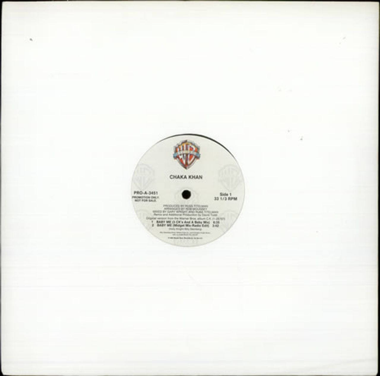 CHAKA KHAN Baby Me (1988 US 4-track promotional vinyl 12" featuring 3 CK's And A Baby Mix, Midget Mix Radio Edit, Big Baby Mix Radio Mix and Instrumental, custom printed labels PRO-A-3451)