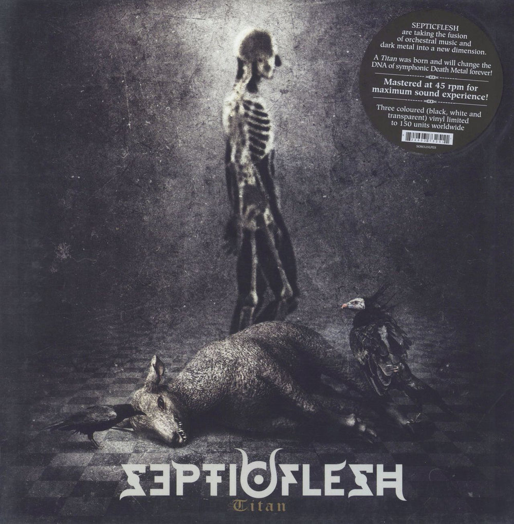 SEPTICFLESH Titan (2014 UK/EU first issue limited edition 10-track 2-LP set pressed on 45rpm Heavyweight Transparent Black / White Vinyl for maximum sound experience. The ninth studio album by the Greek death metal band, including the single Order of Dracul. Housedin a gatefold picture sleeve with illustrated lyric printed inners, still in the hype stickered protective bag. The inner have unfortuantly suffered seam split on both but the sleeve & vinyl grade Near Mint)