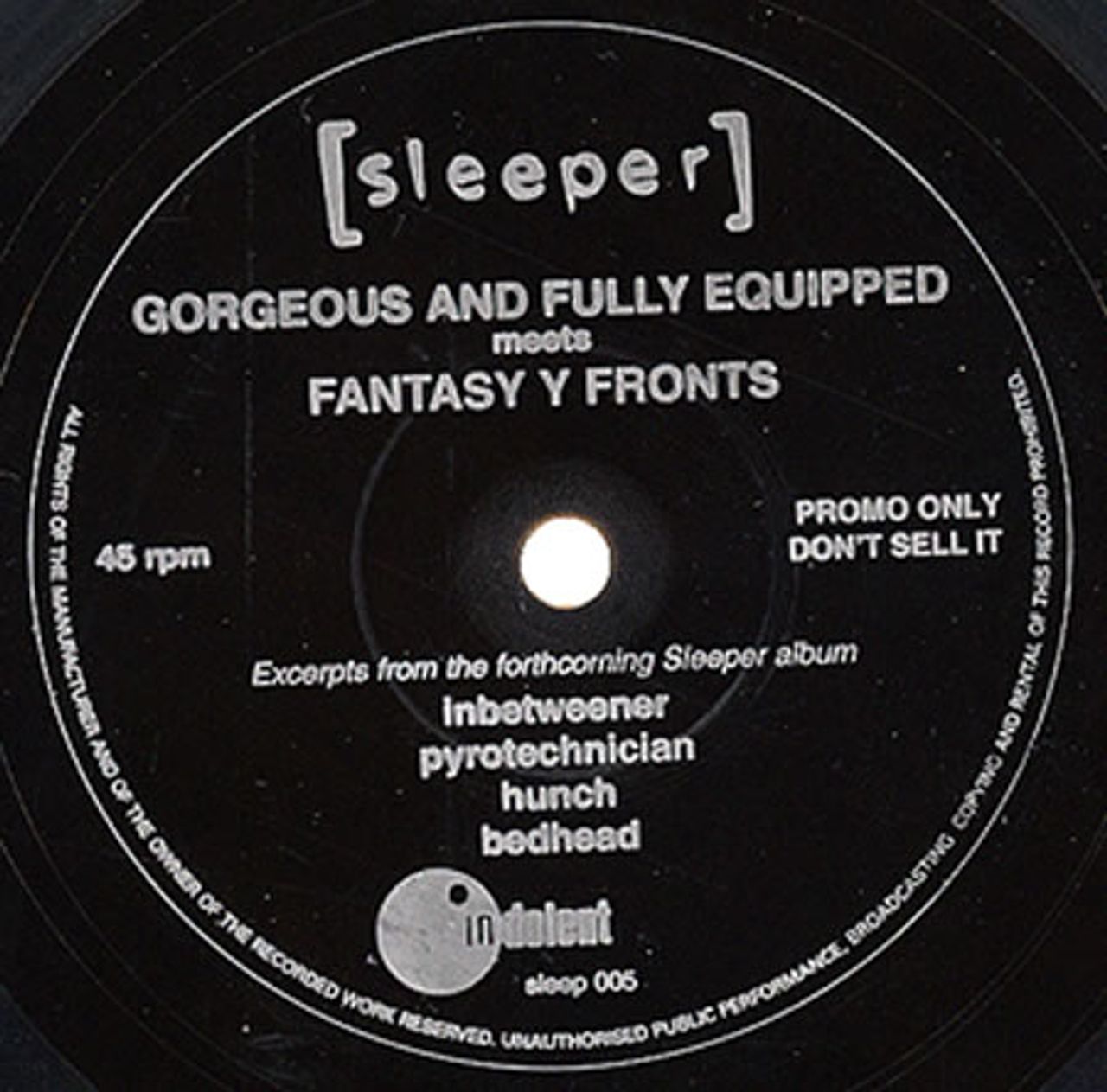 SLEEPER Gorgeous & Fully Equipped Meets Fantasy Y Fronts (Limited Edition 1994 UK promotional-only mail-order 4-track flexi-disc 7" sampler, a single-sided transparent disc featuring excerpts from their debut album. Housed in a plain die-cut sleeve SLEEP005)