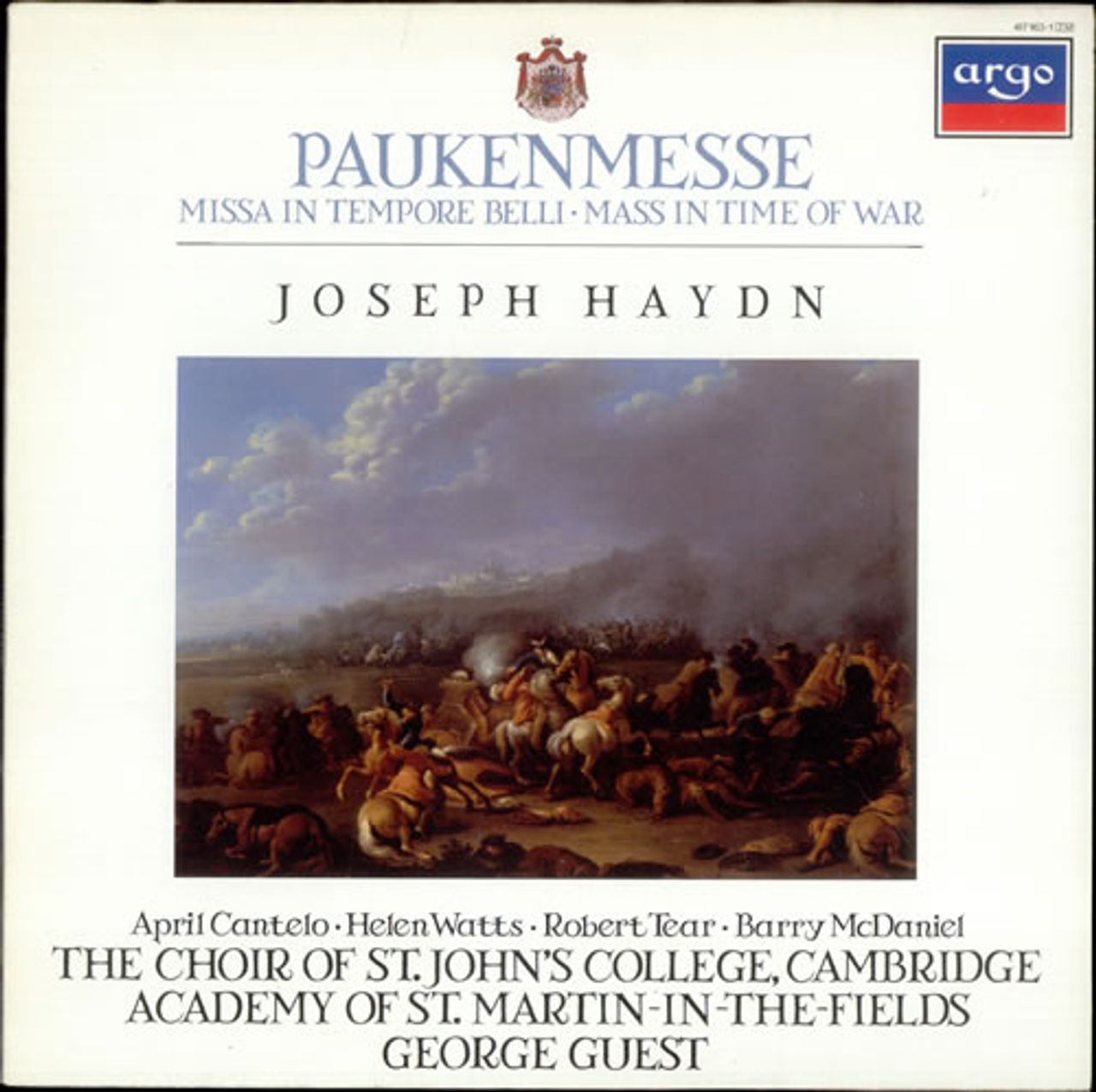 THE CHOIR OF ST. JOHN'S COLLEGE, CAMBRIDGE & THE ACADEMY OF ST. MARTIN-IN-THE-FIELDS conducted by GEORGE GUEST Haydn: Paukenmesse 'Missa in Tempore Belli' (1986 UK stereo vinyl LP, also featuring April Cantelo [Soprano], Helen Watts [Contralto], Robert Tear [Tenor], Barry McDaniel [Baritone] & Stephen Cleobury [Organ], picture sleeve with liner notes in English, French and German. The sleeve shows minimal shelfwear & the vinyl is Near Mint)