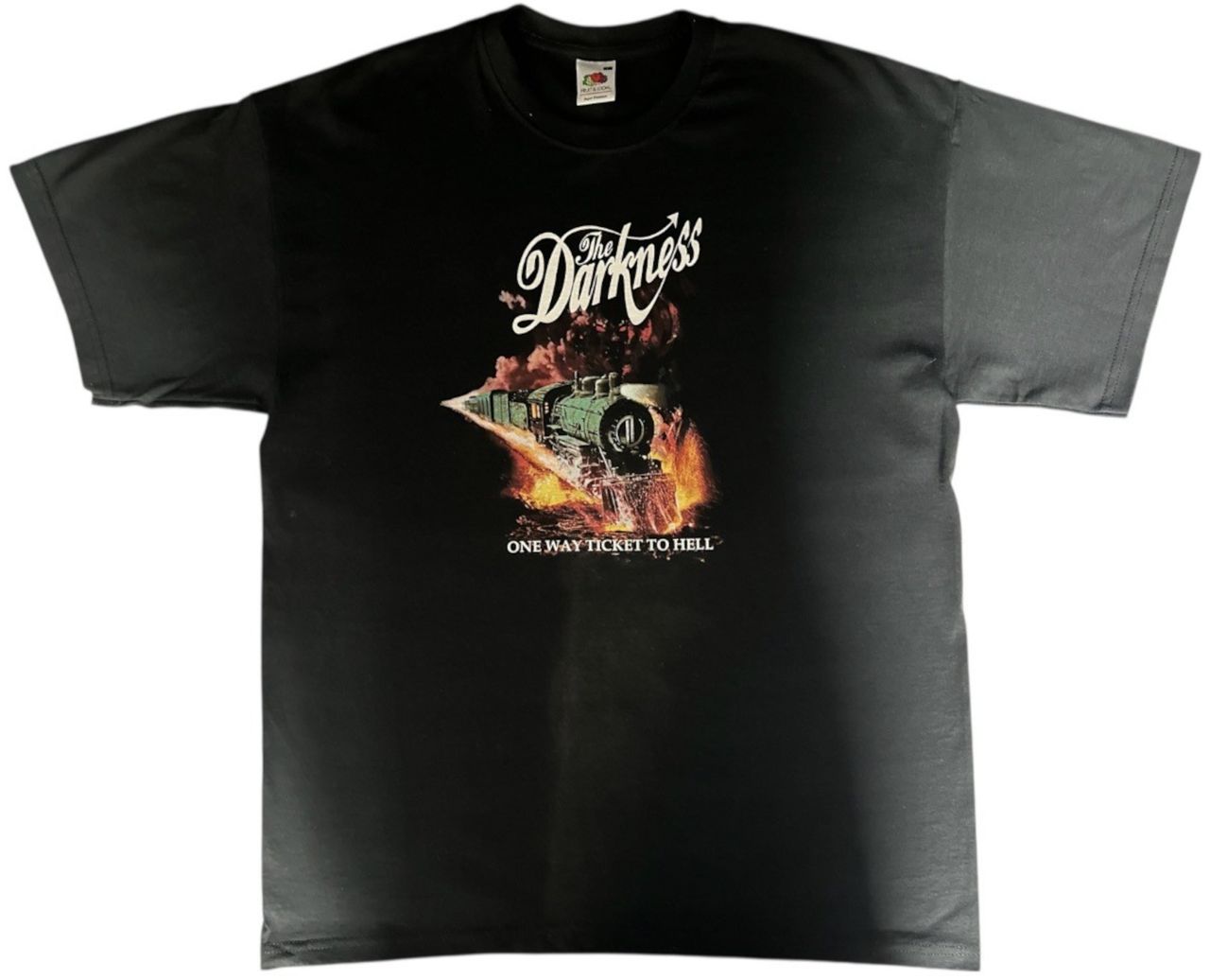 THE DARKNESS One Way Ticket To Hell And Back (2006 original black t-shirt for their 2006 UK Tour. The front graphic mimics the album cover artwork, and the back lists their twelve shows on the tour. Made from 100% light cotton with its original Fruit Of The Loom label intact inside the collar. Overall, the garment shows minimal wear and retains its vibrant colour print to the front and back)