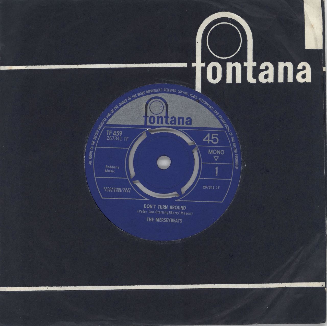 THE MERSEYBEATS Don't Turn Around (1964 UK 7" single with four prong centre, also including Really Mystified, Fontana company die cut paper sleeve. The vinyl is Excellent with just a few faint paper hairlines not affecting play TF459)