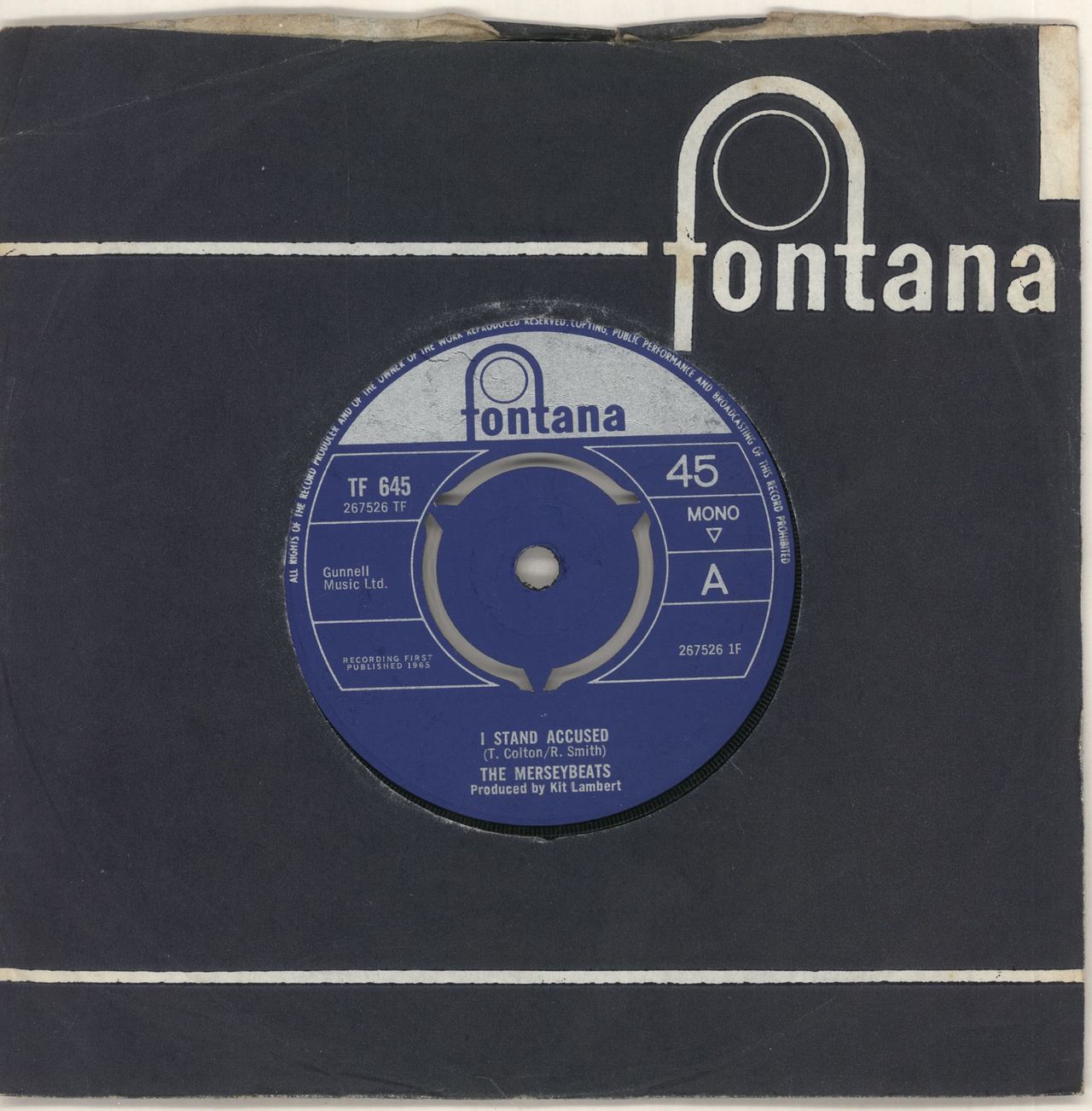 THE MERSEYBEATS I Stand Accused (1965 UK 7" vinyl single with intact three-prong centre also featuring All My Life, Fontana die-cut paper sleeve TF645)