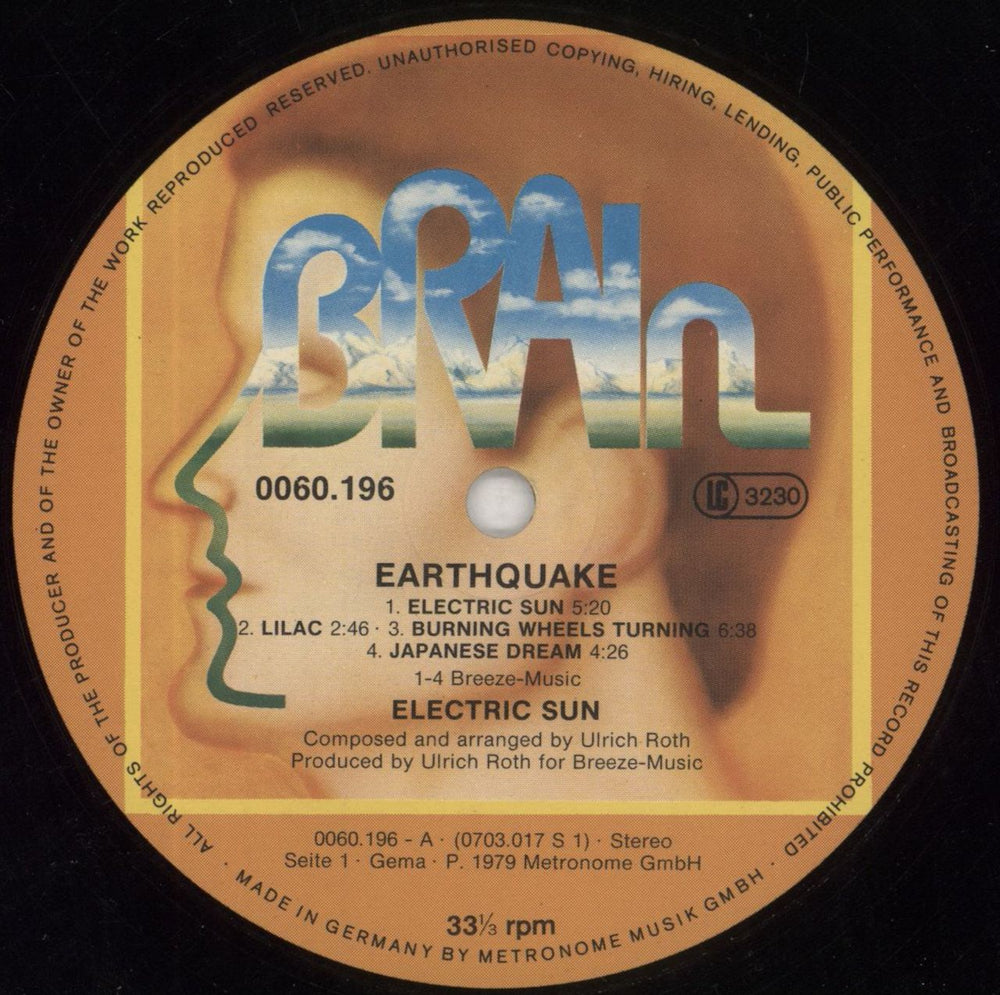 ULI JON ROTH Earthquake (1979 West German 8-track vinyl LP on the legendary Brain label, fully laminated picture sleeve with cosmic cover art by Monika Dannemann & lyric printed inner. The sleeve has a small area of paper loss from sticker removal and displays some light general wear and the inner has no splits or rips, whilst the vinyl has just a few light cosmetic hairlines and minor signs of play.)