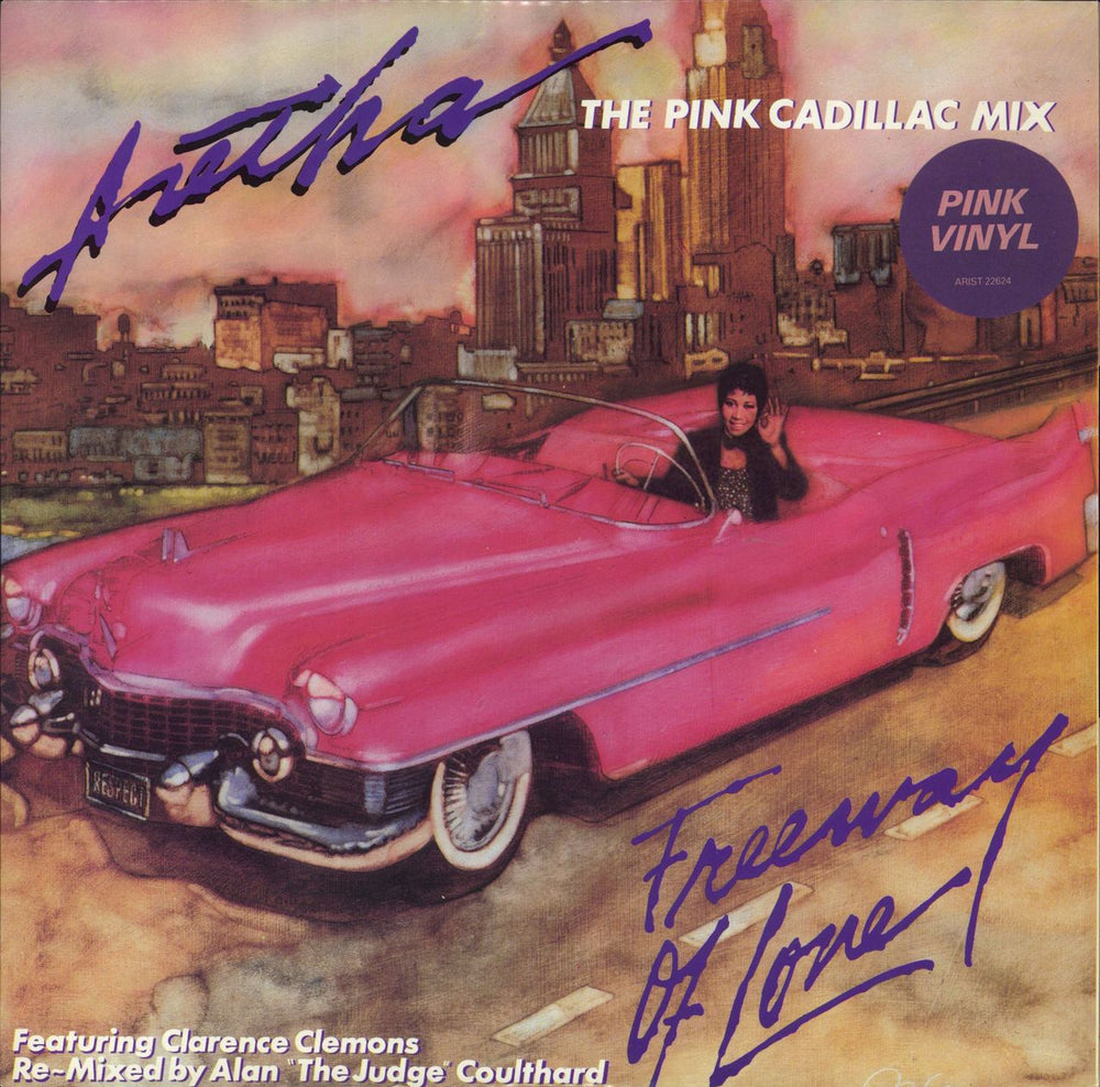 ARETHA FRANKLIN Freeway Of Love (1985 UK Arista label limited edition 3-track 12" single pressed on Pink Vinyl including The Pink Cadillac Mix featuring Clarence Clemons on sax and Dez Dickerson [Prince] onguitar plus Until You Say You Love Me and Jump To It, housed in the glossy picture sleeve. The sleeve shows a little edge/shelfwear and the vinyl reveals the odd cosmetic hairline but few signs of play ARIST22624)