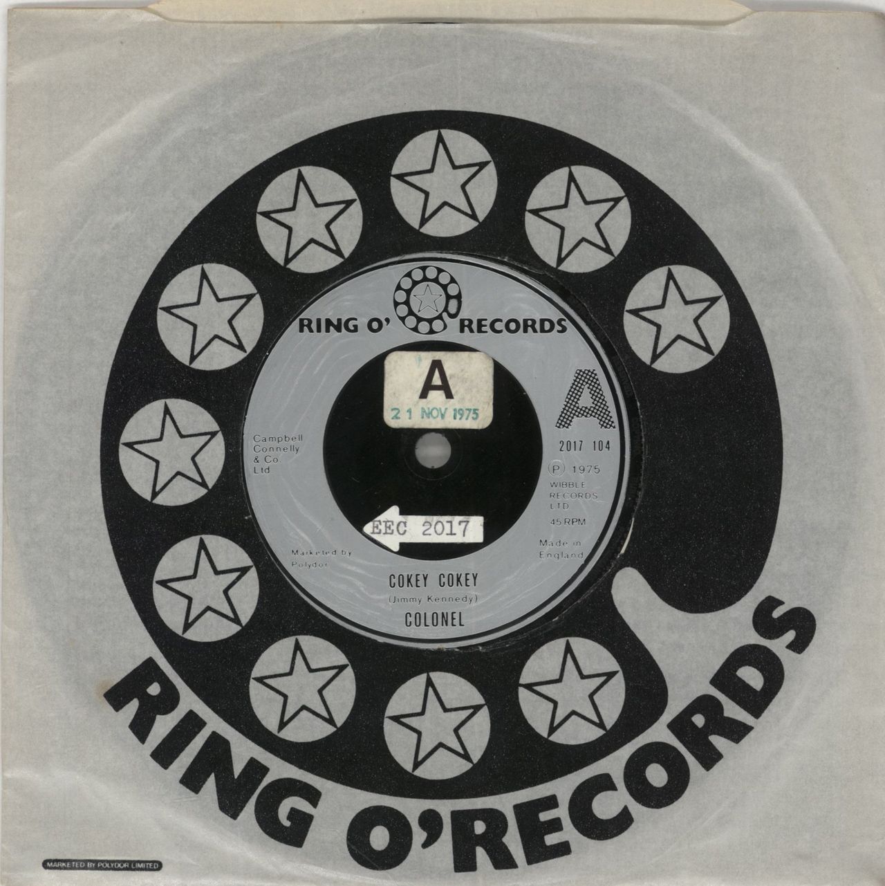 COLONEL Cokey Cokey (Rare 1975 UK advance issue injection moulded 7" vinyl single on Ringo Starr's Ring O'Records label, also including Away In A Manger. This copy has an 'A' sticker on the A label with the date '21 Nov 1975', along with somekind of catalogue number sticker on each label, housed in a die-cut company sleeve. An Excellent copy with minimal play)