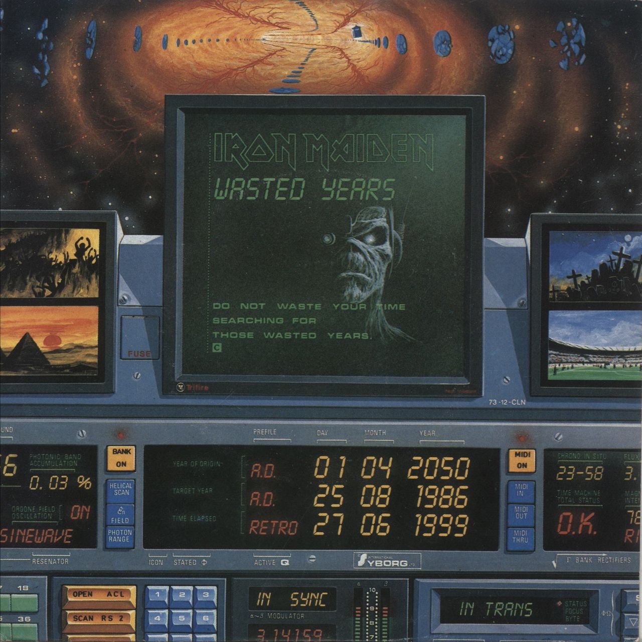 IRON MAIDEN Wasted Years (1986 Dutch/European issue wide centre 7" vinyl single, also includes Reach Out, classic 'Eddie' face on the computer screen picture sleeve without tour dated listed on the reverse. Despite the flimsy nature of the paper, the sleeve shows only light signs of wear with a light sticker mark on the back, whilst the vinyl remains in a stunning near mint condition)