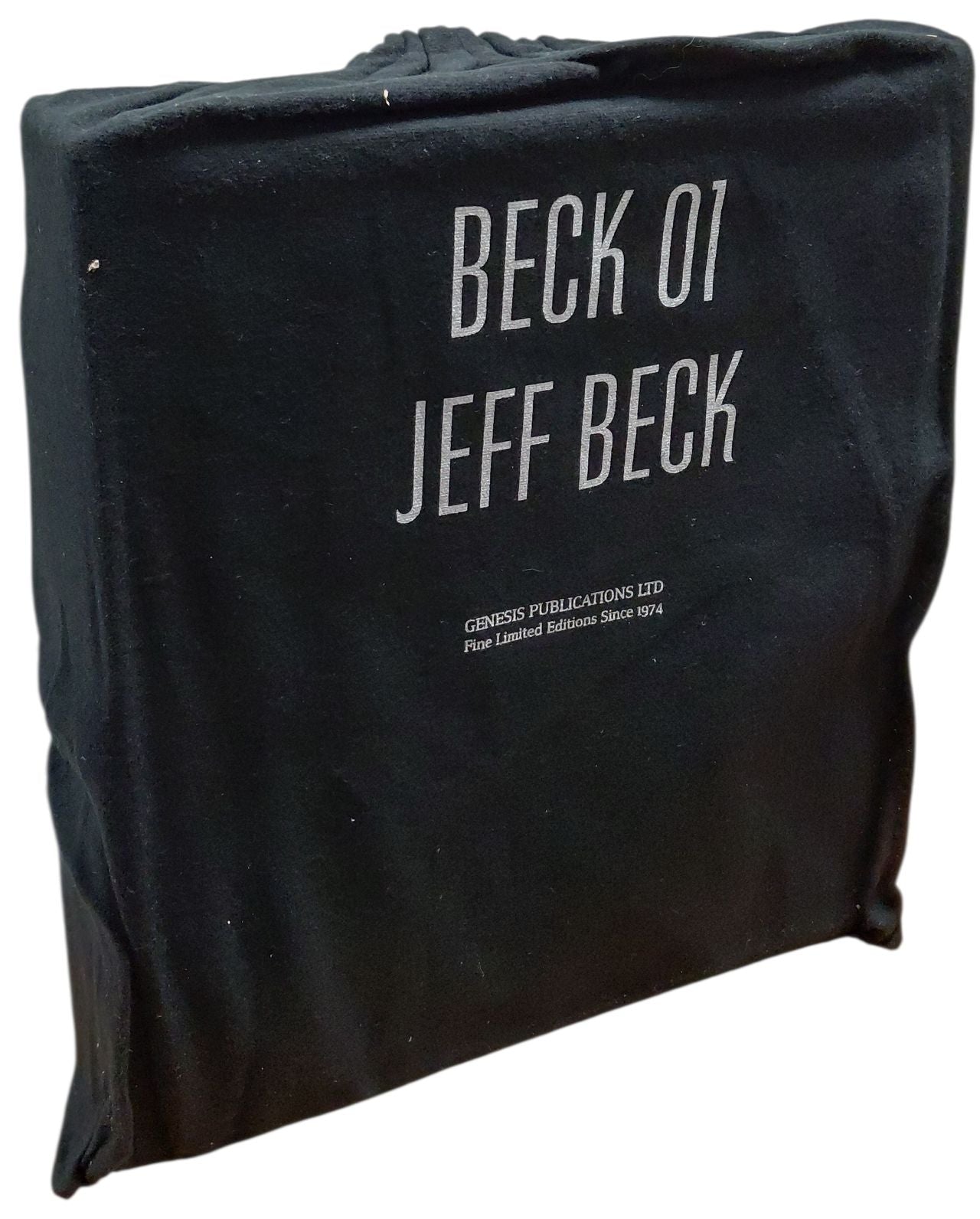 JEFF BECK Beck01 (Rare 2016 UK limited edition 352 page hard back book printed on Heavyweight 200gsm archival grade matt art paper, quarter bound by hand in Italian leather and aluminium, with silver page edging and hand tooling. A stamped metal front cover reproduces a Californian number plate from the year Beck was born, inset into the cover. The large format book is housed in an archival case, featuring a foil-blocked illustration inspired by Von Dutch's legendary pinstriping designs.These were limited limited to 2,000 copies, and this example is number numbered 799, hand signed by Jeff Beck, with a special printed pull string bag. This example remains in a fantastic condition, and remains in the original card mailer!)