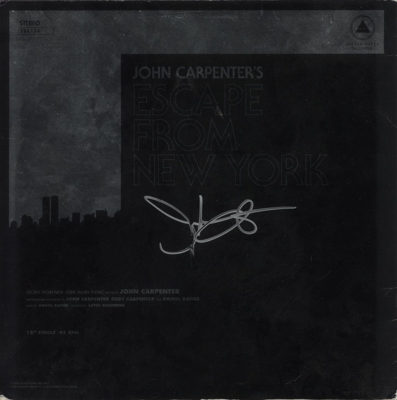 JOHN CARPENTER Halloween / Escape From New York (2016 US limited edition 2-track 12" vinyl single featuring two of his classic film themes recorded with his Lost Themes Band. Pressed on Red Vinyl and Signed by John Carpenter himself! The sleeve shows some moderate edgewear and creasing, whilst the vinyl shows few signs of play; remaining Excellent SBR156)
