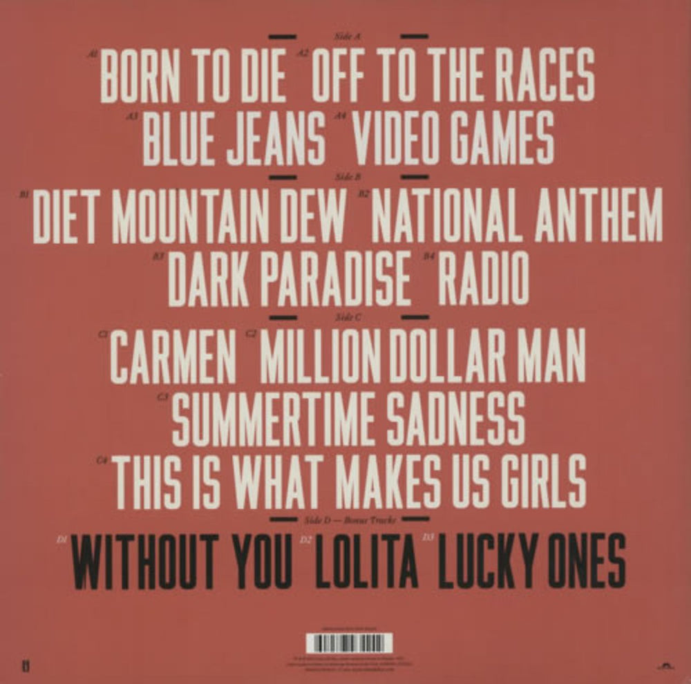 LANA DEL REY Born To Die (Deluxe Edition UK/EU 15-track double album 2-LP, her major label debut album first released in 2012, featuring songs that are atmospheric, orchestral retro-'60s-sounding pop that showcase her torchy image and sensuously husky singing style. Includes the hit single Video Games, plus 3 bonus tracks: Without You, Lolita and Lucky Ones. Gatefold picture sleeve with red title text, lyric insert and factory sealed. Recommended)