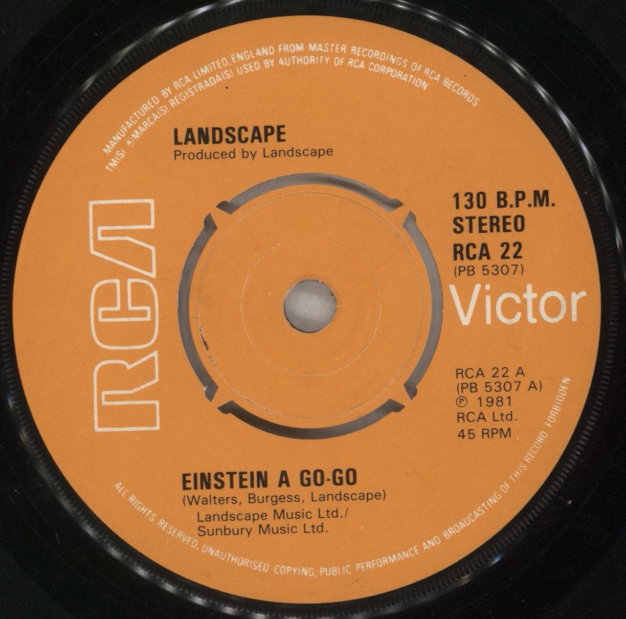 LANDSCAPE Einstein A Go-Go (1981 UK 7" vinyl single with intact four prong centre, also including New Religion, record company die cut paper sleeve. RCA22)