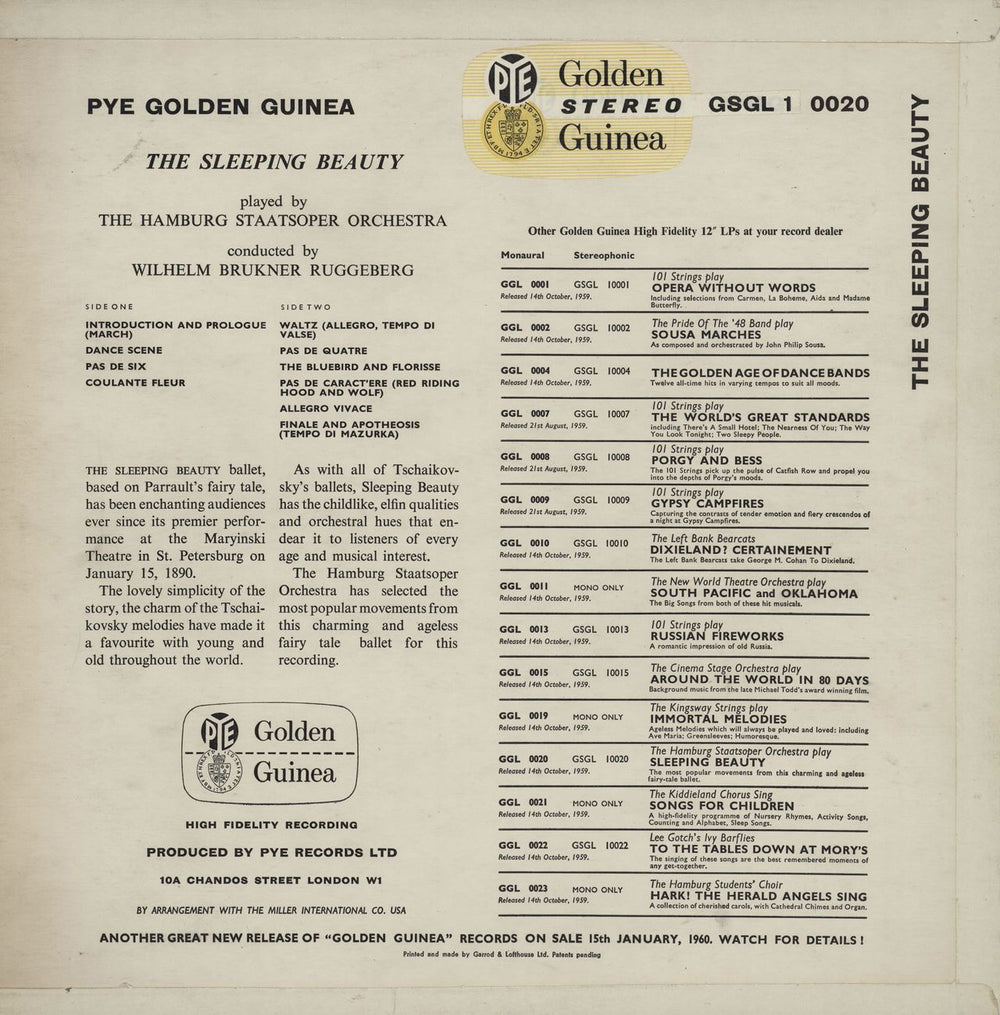 THE HAMBURG STAATSOPER ORCHESTRA conducted by WILHELM BRUKNER RUGGEBERG The Sleeping Beauty (1959 UK STEREO LP issue of the 1957 performance, 'Stereo' stickered front laminated flipback picture sleeve. The sleeve shows just a little light shelfwear & the vinyl is flawless GSGL10020)