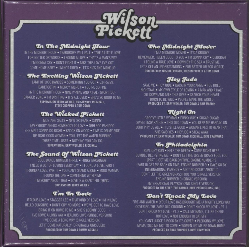 WILSON PICKETT The Complete Atlantic Albums Collection (Sealed 2017 UK/EU limited edition 10-CD collection. After signing with Atlantic Records in 1964, the Alabama-born singer/songwriter went on to record unforgettable hits like 'Mustang Sally', 'Land of 1000 Dances' and his signature track, 'In the Midnight Hour'. this collection celebrates his legacy by bringing together all 10 of the studio albums that the rock and roll hall of famer recorded with Atlantic Records between 1965-1971. The 10 classic studio albums are: 'In the Midnight Hour' (1965), 'The Exciting Wilson Pickett' (1966), 'The Wicked Pickett' (1967), 'The Sound of Wilson Pickett' (1967), 'I'm In Love' (1968), 'The Midnight Mover' (1968), 'Hey Jude' (1969), 'Right On' (1970), 'Wilson Pickett In Philadelphia' (1970), and 'Don't Knock My Love' (1971). Each album in thier own card wallet picture sleeve, housed in a clam shell style picture box, and remains sealed in the hype stickered shrink)
