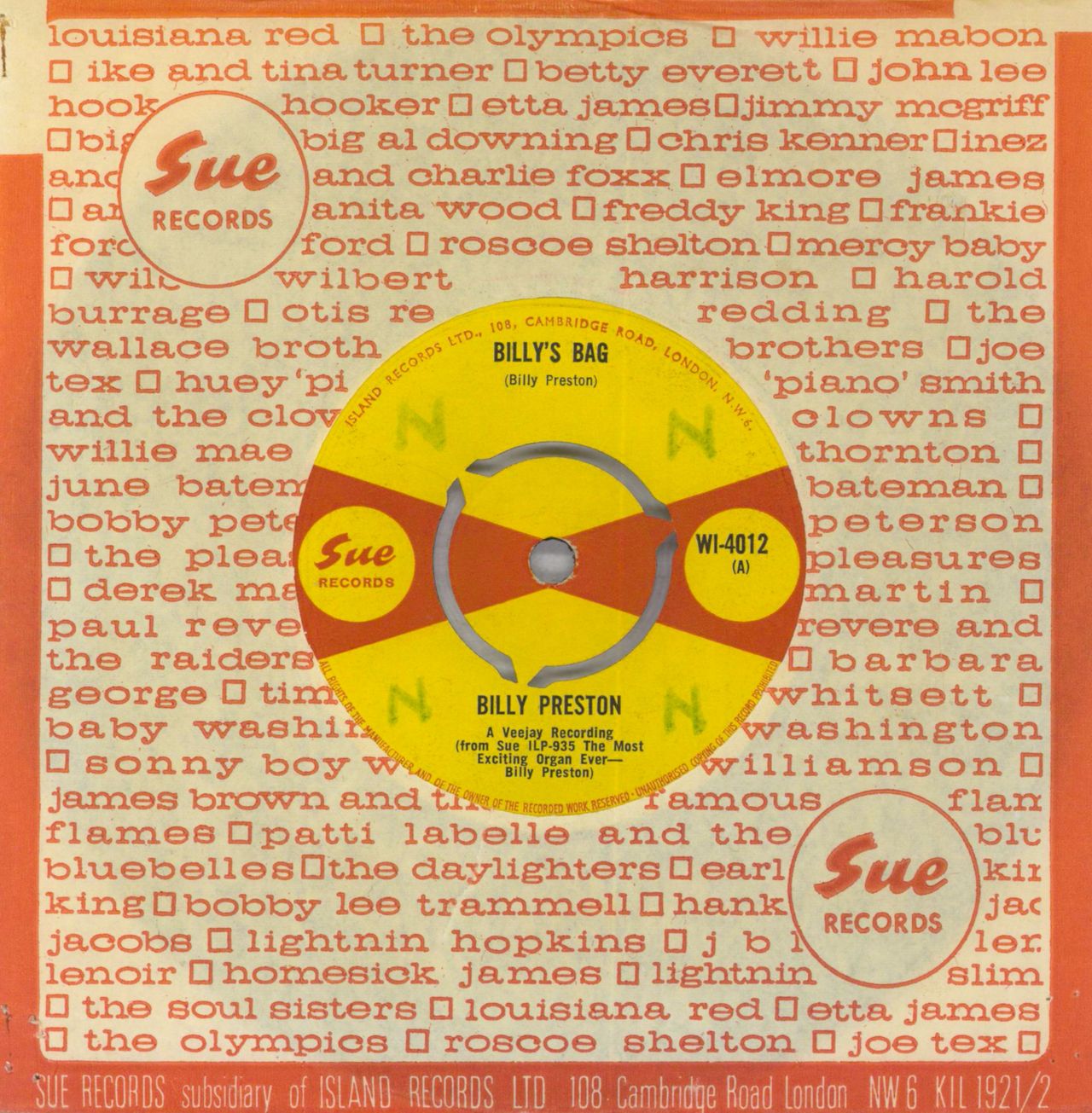 BILLY PRESTON Billy's Bag (1966 UK 7" vinyl single with intact three prong centre featuring Billy's '65 organ killer, also including Don't Let The Sun Catch You Cryin', Sue company die cut paper sleeve. Apart from some initials on the A Side label, this copy remains in excellent condition with few signs of being over fifty years old WI-4012)