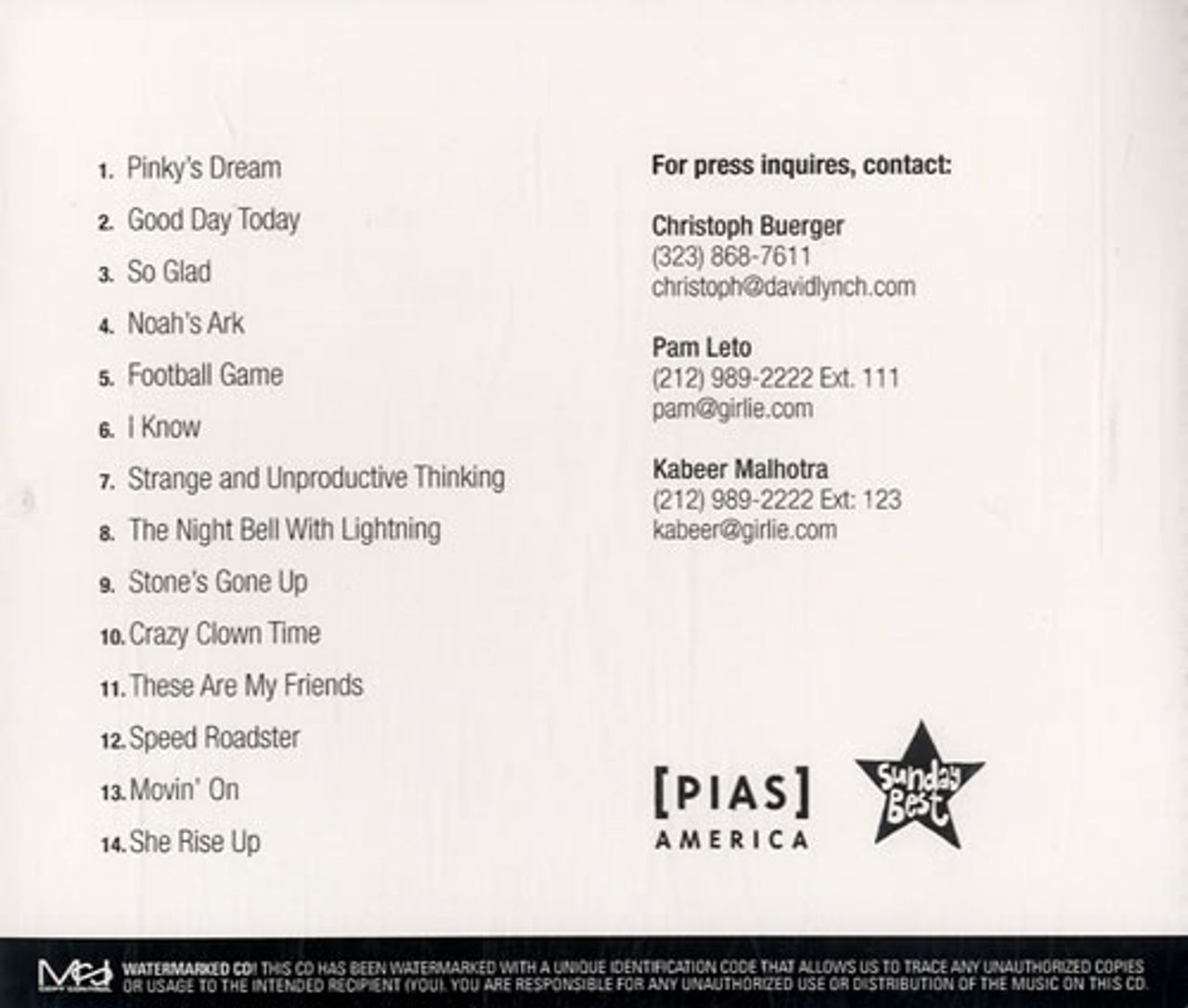 David Lynch Crazy Clown Time US Promo CD-R acetate