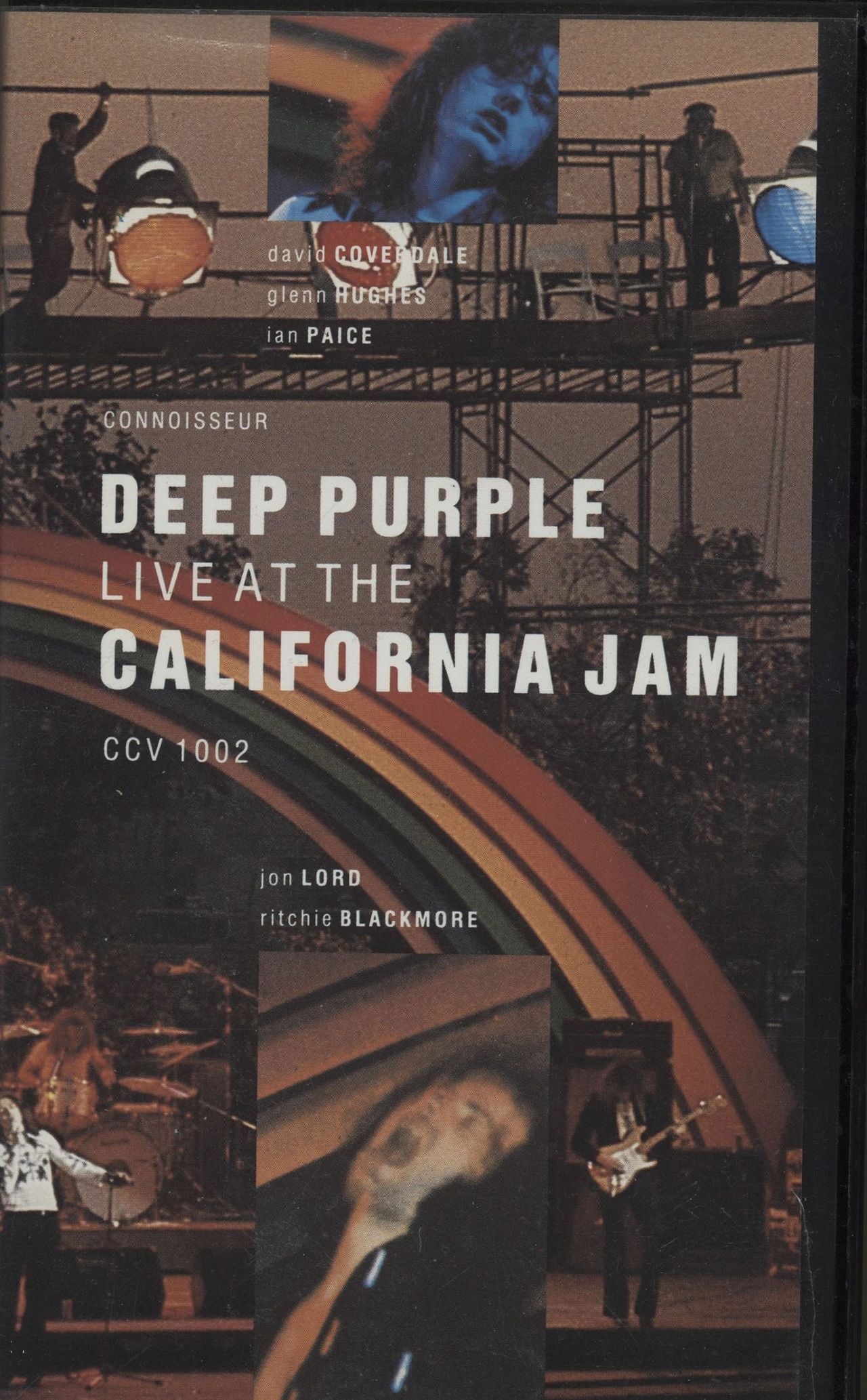 DEEP PURPLE Live At The California Jam (Original 1991 UK 6-track VHS tape featuring their live performance at the California Jam festival at the Ontario Speedway near Los Angeles on 6th April 1974, with versions of Burn, Might Just Take Your Life, Mistreated, Smoke On The Water, You Fool No One / The Mule and Space Truckin' bringing the festival to life. The video tape comes housed inside its casing with a wrap-around picture insert)