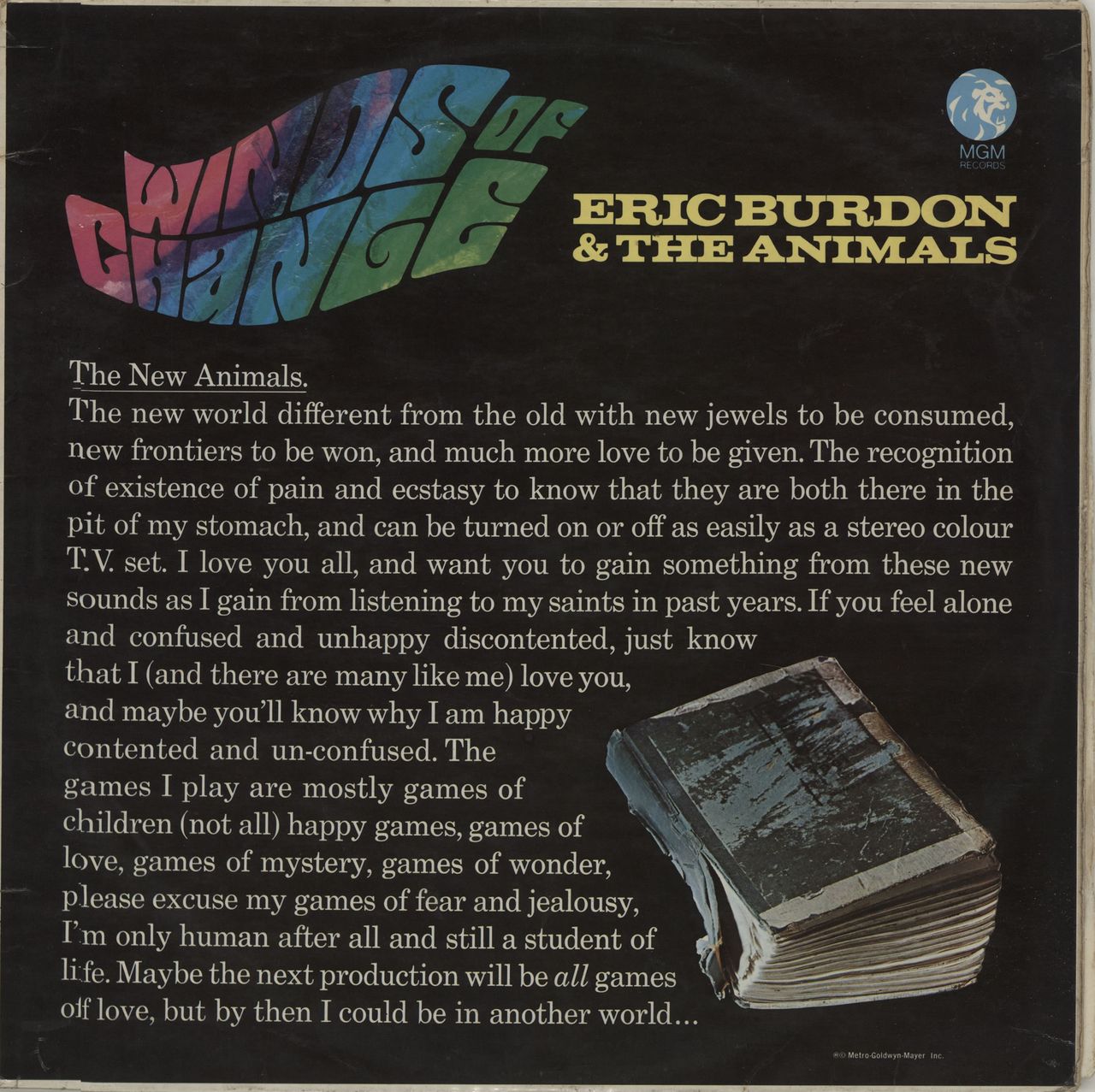 ERIC BURDON & THE ANIMALS Winds Of Change (1967 UK 11-track STEREO LP on the yellow 'unbreakable' MGM label, front laminated flipback picture sleeve. The sleeve is Very Good, with some minor storage wear and a small split on the top flipback,but has only a few light creases to the laminate. The labels displays some spindle marks but are otherwise clean & free from any writting, whilst the vinyl has only a few light noticeable surface mark, but there is very little lessening in sound quality MGM-CS-8052)