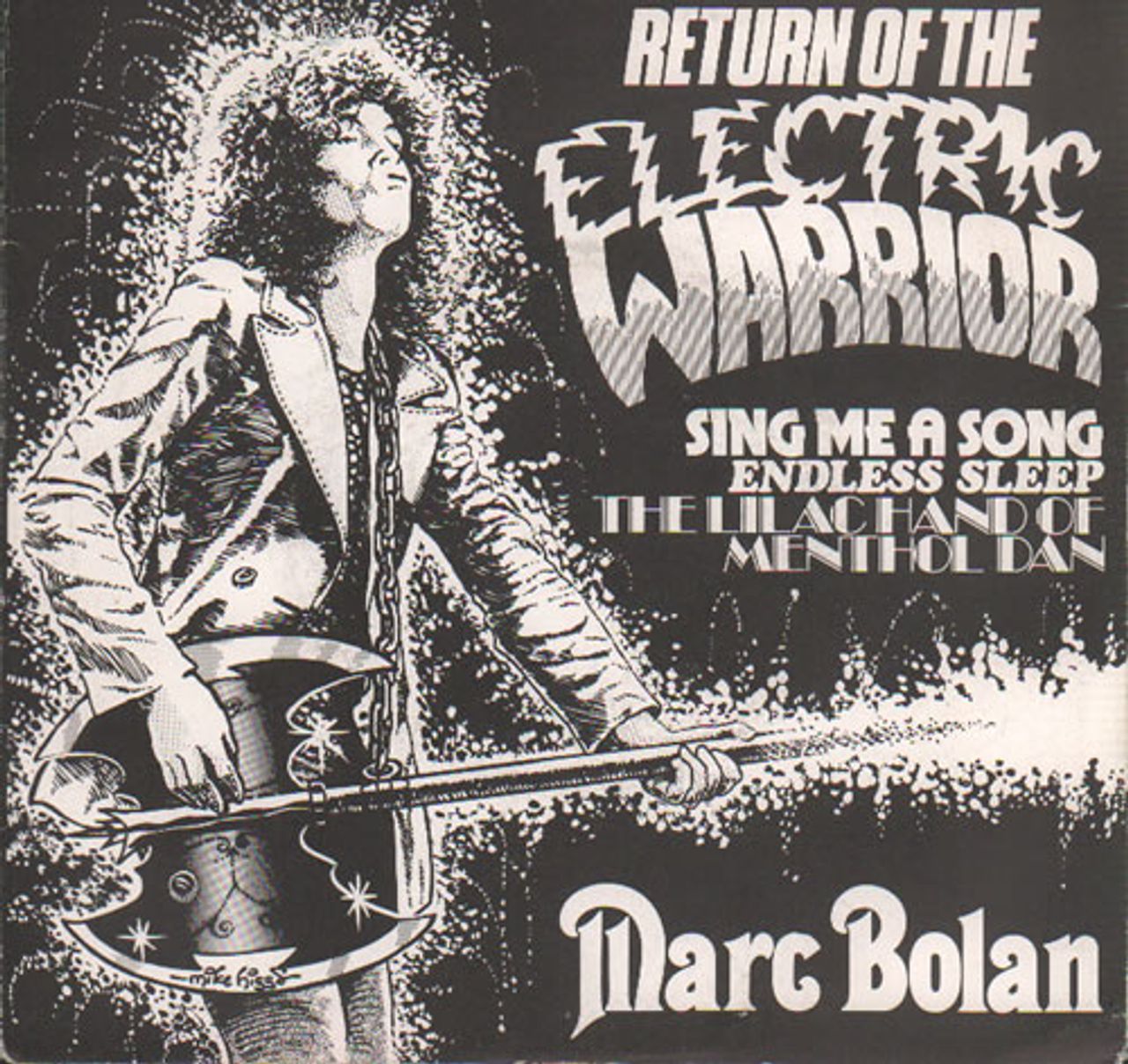 MARC BOLAN Return Of The Electric Warrior (1981 UK 3-track advance promotional white label vinyl 7" for the EP release, with hand written labels, including Sing Me A Song, Endless Sleep and The Lilac Hand Of Menthol Dan, within a commercial release cartoon Bolan picture sleeve MBFS001)