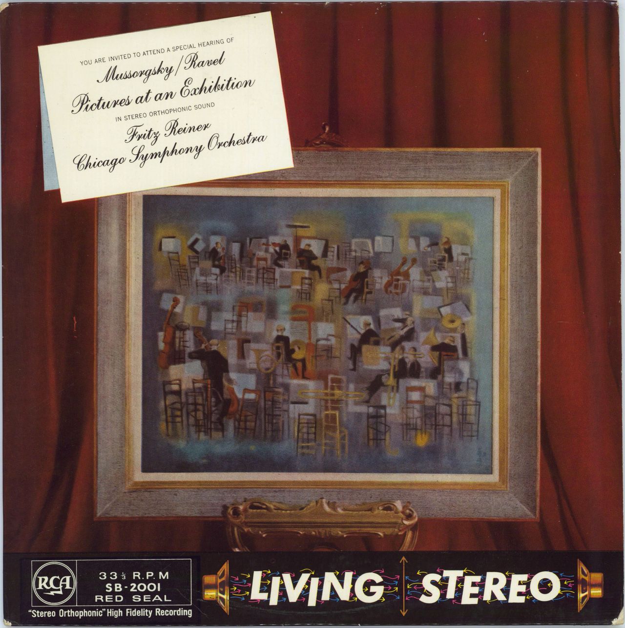 CHICAGO SYMPHONY ORCHESTRA conducted by FRITZ REINER Pictures At An Exhibition (1958 UK STEREO LP on a 'deep groove' silver spot RCA label, front laminated pasted picture sleeve with 8/58 date on the back. The flimsy sleeve shows just a little light shelfwear with a bit of edge scuffing and the vinyl remains in superb condition with few signs of play