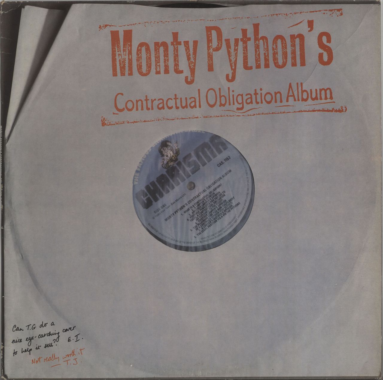 MONTY PYTHON Contractual Obligation Album (1980 UK 24-track comedy vinyl LP with custom designed labels & a rather ridiculous sleeve, complete with die-cut credits inner. This pressing has the track 'Farewell To John Denver' listed on the inner, but stamped 'censored' and absent on the vinyl, on subsequent releases following legal advice it was replaced by the title 'Omitted On Legal Advice' CAS1152)