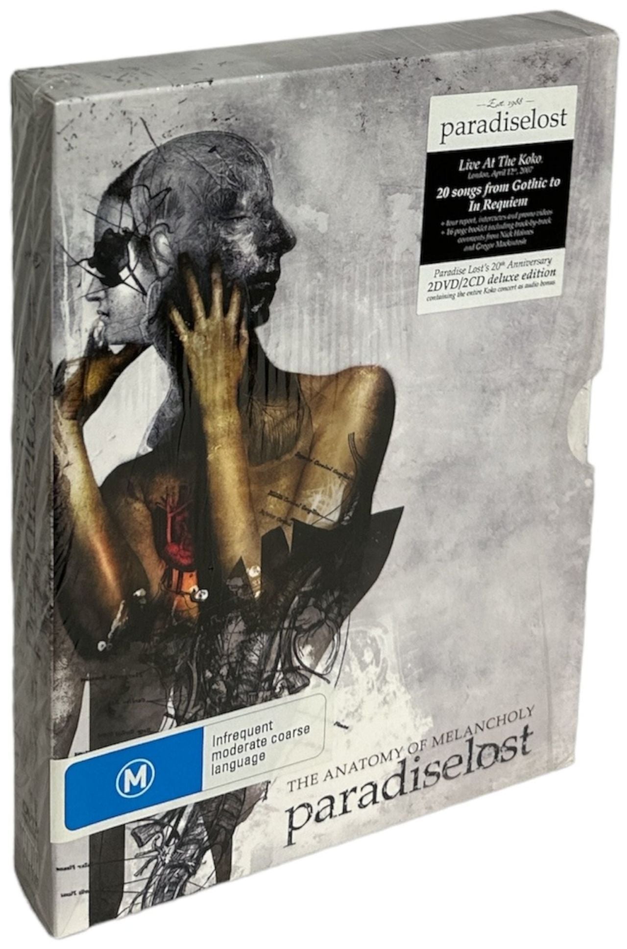 PARADISE LOST The Anatomy Of Melancholy (2008 UK 'Deluxe Edition' 4-disc [2DVD/2CD] set - On April 12th 2007, Paradise Lost played a sold-out show at Camden's Koko in London to record a DVD; this bumper edition comprises the the full performancefootage & recordings plus Bonus DVD Material including an interview with the band, a feature on the fans at Koko, a 27 minute 'Lost In Europe' 2007 tour report, two music videos and a documentary trailer. Housed in a digipak picture sleeve complete with a picture booklet containing track-by-track liner notes by Nick Holmes & Gregor Mackintosh, with an outer card slipcase)