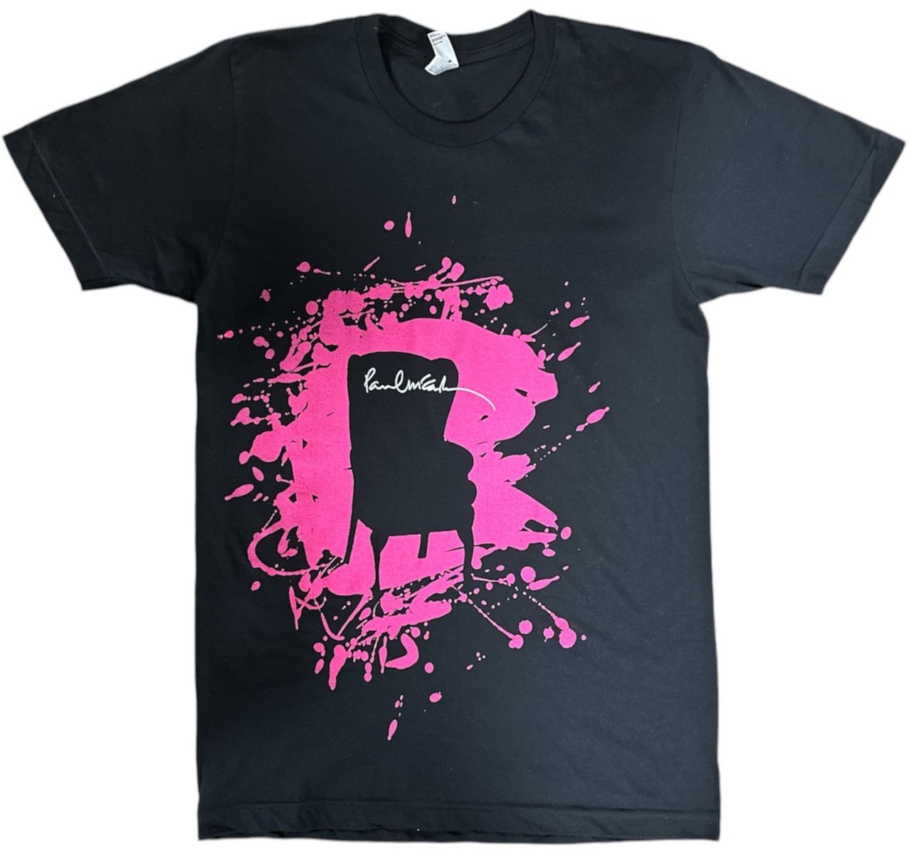 PAUL MCCARTNEY AND WINGS Paul McCartney - L'Olympia, Paris (Official 100% cotton round neck short sleeve black T-shirt [Size S], only available at his concert at L'Olympia, Paris on 22 October 2007. It features a striking pink 'splatter' surrounding a lounge chair design with a signature logo on the front and the gig details in white text on the back. The shirt measures 28" collar to hem and 18" pit to pit and looks unworn)