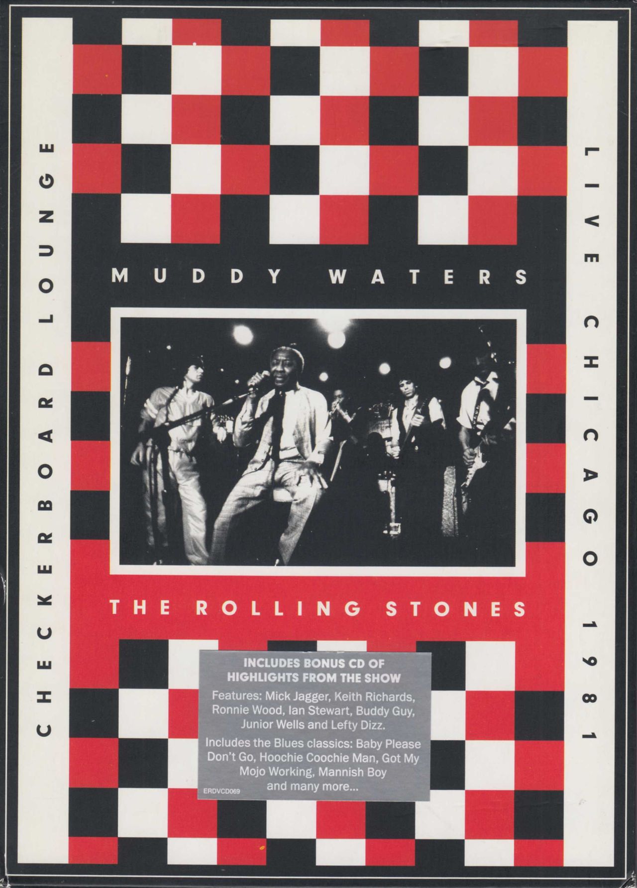 ROLLING STONES & MUDDY WATERS Live At The Checkerboard Lounge Chicago 1981 (2012 UK 2-disc [DVD/CD] set - On 22nd November 1981, in the middle of their mammoth American tour, the Rolling Stones arrived in Chicago prior to playing 3 nights at the Rosemont Horizon. Long influenced by the Chicago blues, the band paid a visit to Muddy Waters' club the Checkerboard Lounge to see the legendary bluesman perform. It didn't take long before Mick Jagger, Keith Richards, Ronnie Wood and Ian Stewart were joining in on stage and later Buddy Guy and Lefty Dizz also played their part. It was a unique occasion that was fortunately captured on camera. Now, restored from the original footage and with sound mixed and mastered by Bob Clearmountain, this amazing blues night is being made available in an official release for the first time. Comprised of a Region 0 DVD & Bonus CD; standard DVD case with picture sleeve inlay and within a hype stickered card picture slipcase)