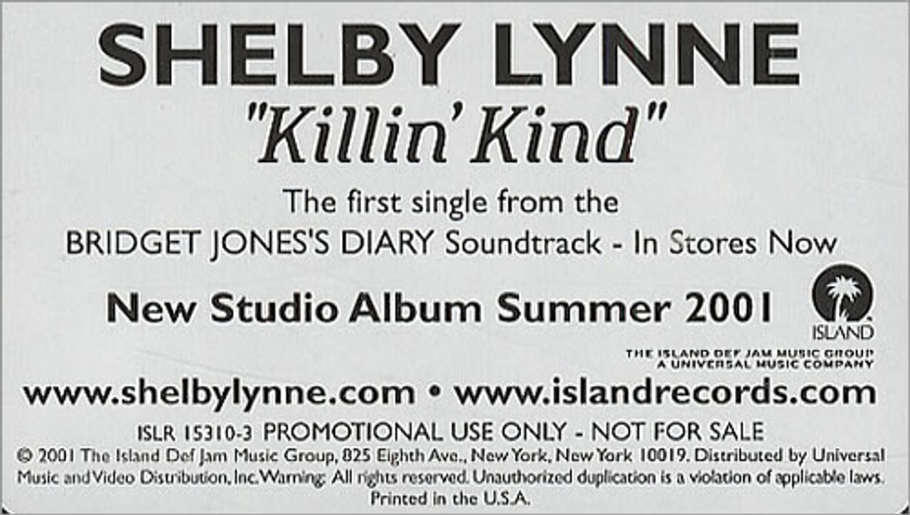 SHELBY LYNNE Killin' Kind (US NTSC 1-track promo video featuring music from the soundtrack to Bridget Jones's Diary, custom stickered card slipcase ISLR-15310-3)