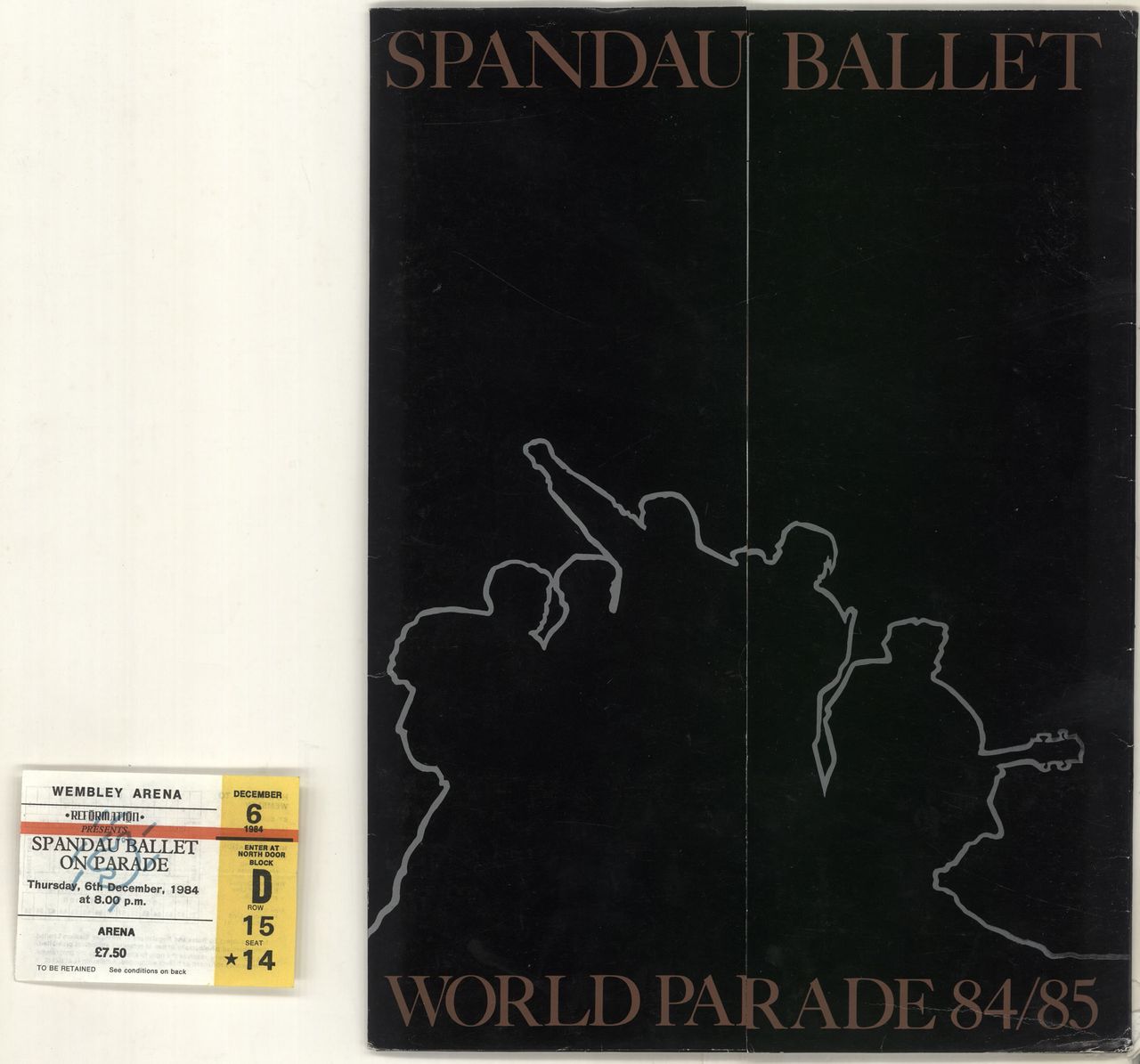 SPANDAU BALLET World Parade 84/85 (Official 1984 UK 24 page 13" x 9½ tour programme featuring individual messages from each of the band members, tour personnel and great photographs throughout, plus the original merchanise leaflet still attached to the centrepages. Also includes a custom printed outer folder which has the tour dates on the back of the fold-out title cover and also a ticket stub for the Wembley Arena show on 6th December 1984. Although the folder has a few scuff marks, the programme within remains in a really nice condition)