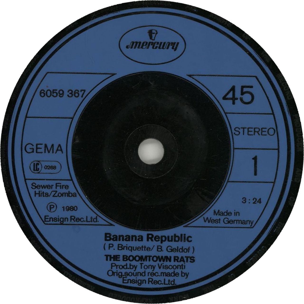 BOOMTOWN RATS Banana Republic (1980 German blue injection moulded 7" vinyl single, also including Man At The Top, plain die-cut paper sleeve)